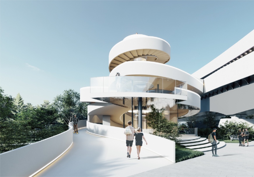 建筑的圆心由无障碍电梯井构成,两条环形动线环绕上升,构成了即美观又实用的建筑外观。靠近内侧的环线以消防用途为主,便于快速撤离,外侧坡道则以观景、休闲为主。通过与设计师的交流我们了解到,在最初的设计中,外侧坡道还可供自行车通行,但很可惜的是,在运营过程中,出于安全考虑而被禁止。