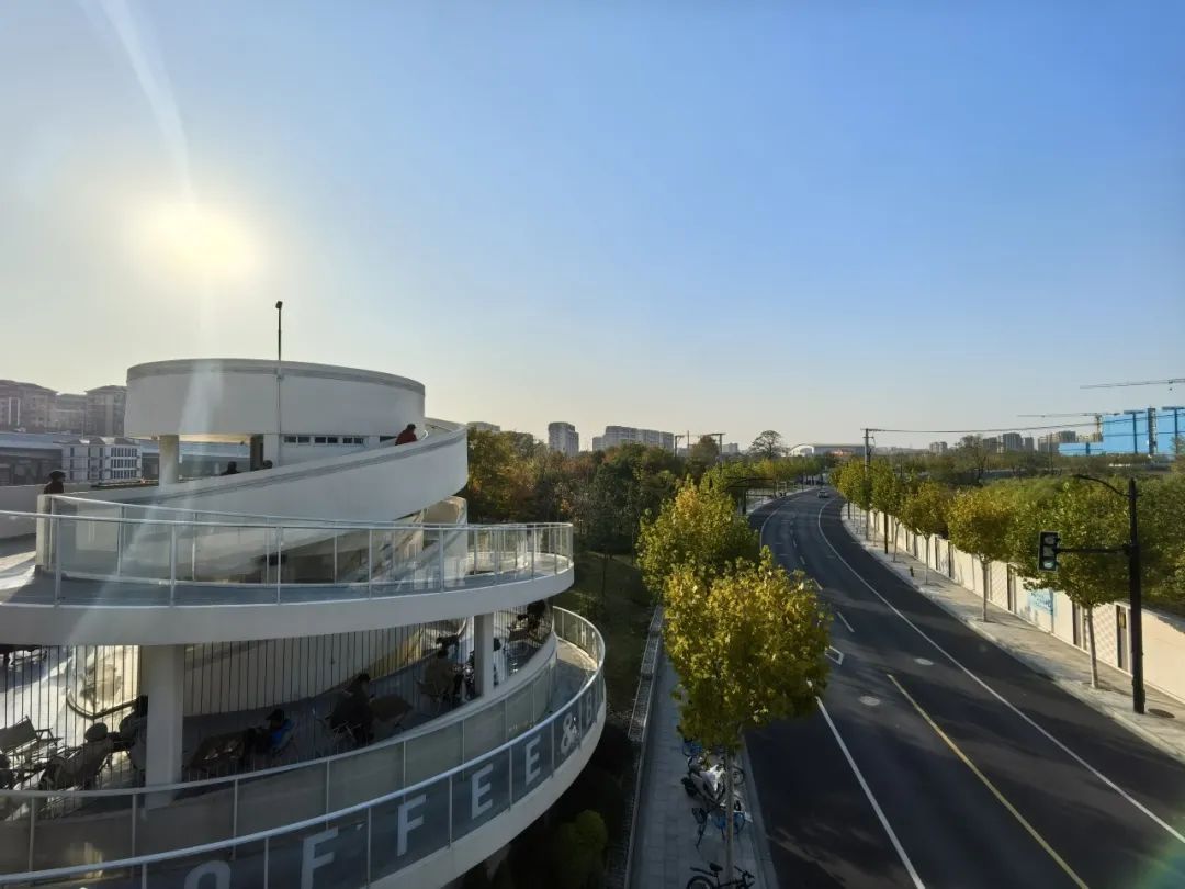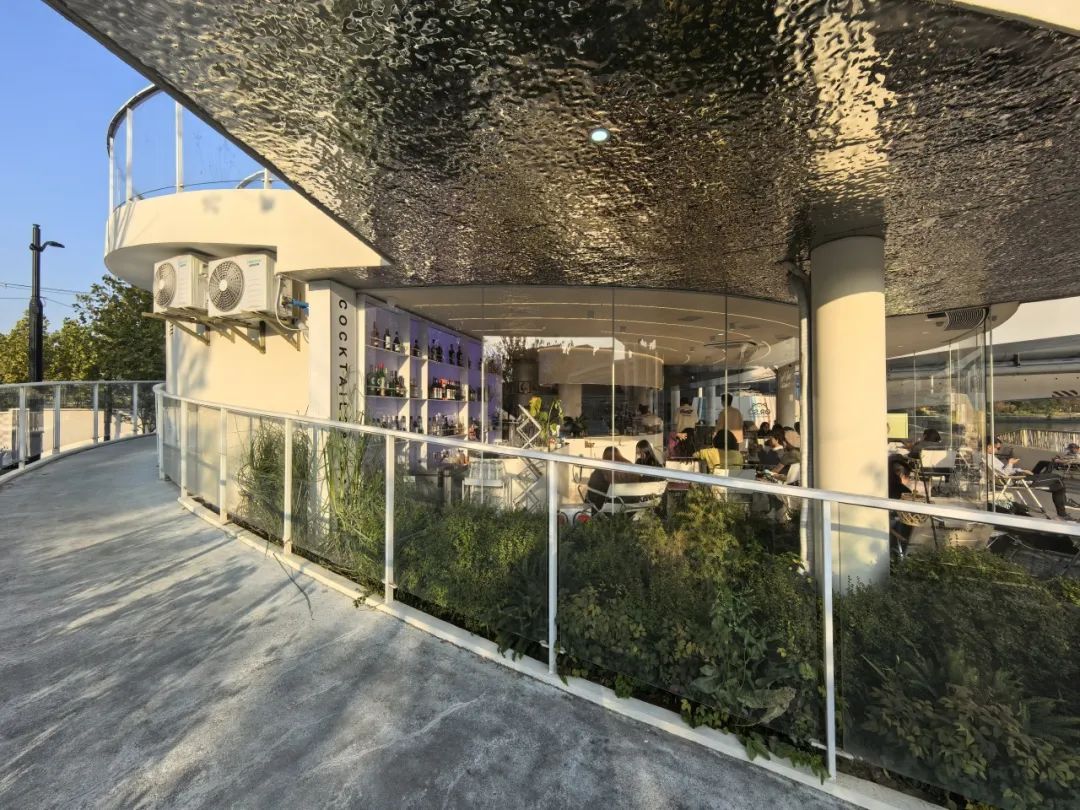 咖啡馆本身地处绿地公园中,通透的玻璃幕墙和随处点缀的植物景观更透露出一些漫不经心的精致感。在夕阳余晖中,可以看到远处天空掠过刚刚起飞的飞机,中环上的车水马龙,波光粼粼的苏河,沿岸跑步的人,散步的小狗,还有“偷感”很重的夜鹭。