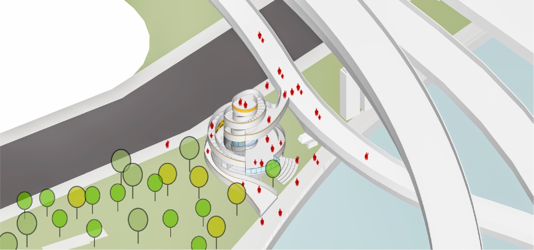 而驿站直接将二层与辅道相连,改变了辅道原来单一的通行功能,使得周边居民可以更舒适安全地抵达并享受苏河北岸空间。同时,城市管理者为了缓解基础设施带来的割裂感,充分利用立交桥下空间,植入了如洛克公园、运动场馆以及宠物友好空间等。
