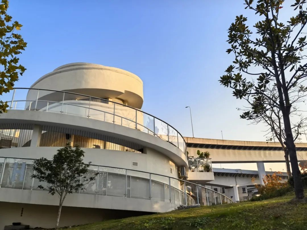 选址过程中,由于驿站不可避免地需侵占部分绿地,因此,设计师在与绿化部门商讨后,决定采用圆型建筑以节省用地;而为了缝合苏河两岸功能,提升公共空间利用率,驿站又获得道路部门的支持,从而能在中环辅道上开设出入口。设计师则是采用设计手法,将建筑对中环及沿岸步道的影响降至最低,却能收获最大的社会效益。