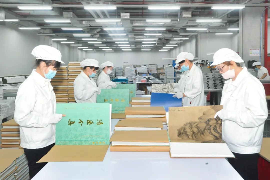 在装帧上,“大系”属于大开本、多页、极为厚重的典册,同样存在不少挑战。在雅昌车间里,“大系”装帧由专人负责,并使用专用设备。新型锁线机页缝针孔极细小,后期溢胶更小,不会破坏画作的整体感。在书脊贴上超密白纱布、堵头布,包纸底白洋布……这些工序,都要靠手工完成。此外,为了保证书籍的稳定性,工作人员还要重复翻看样书,检验装帧质量是否经得起“千百次翻阅”的考验。