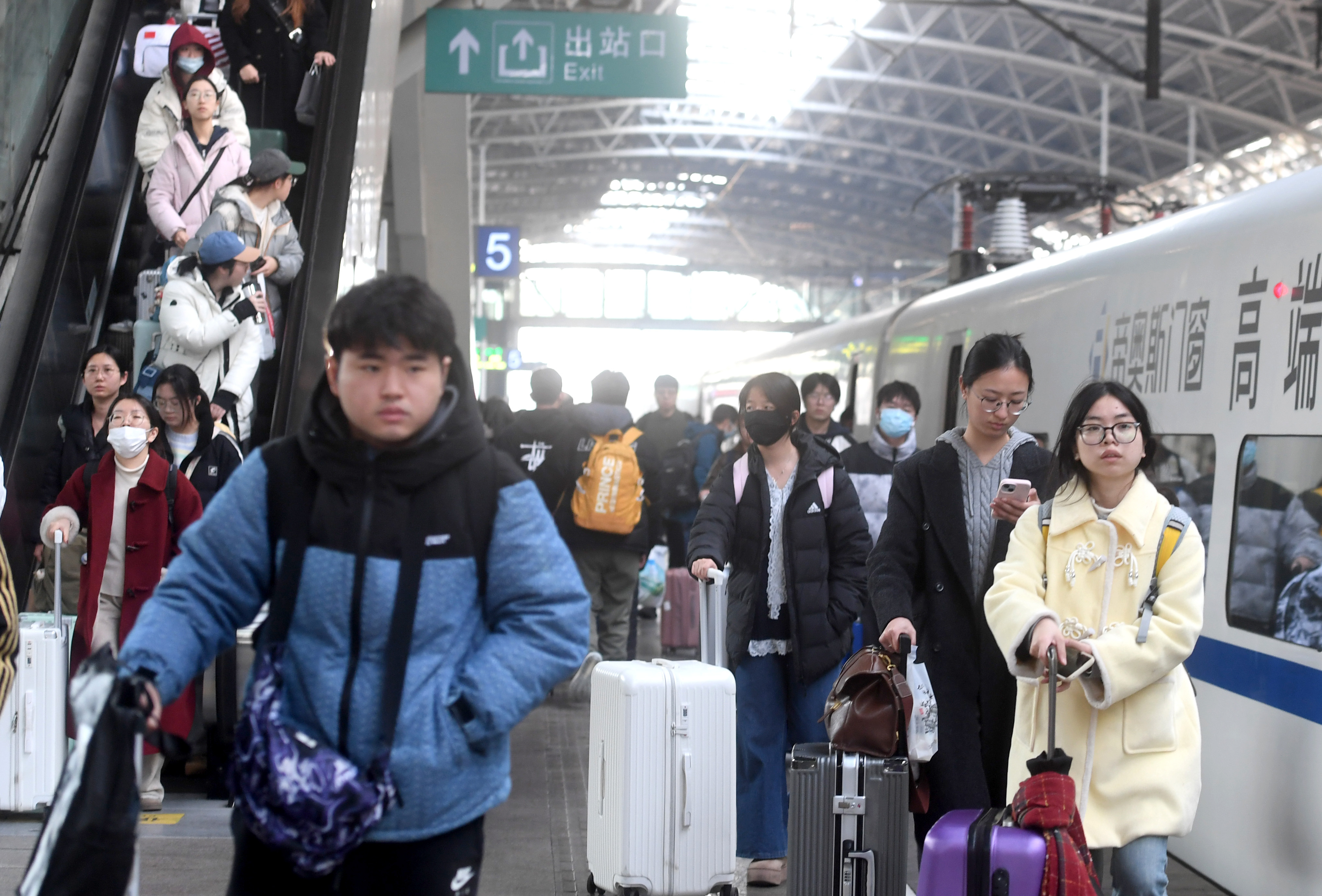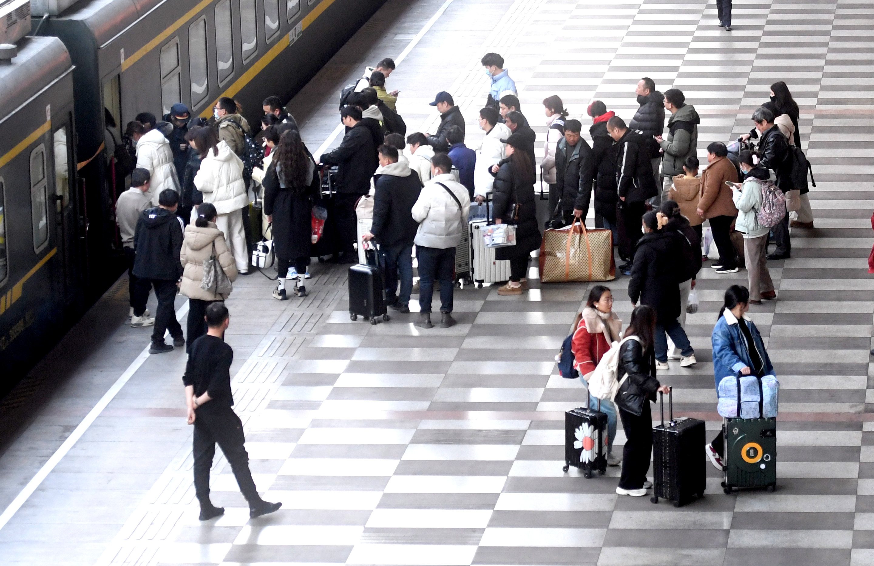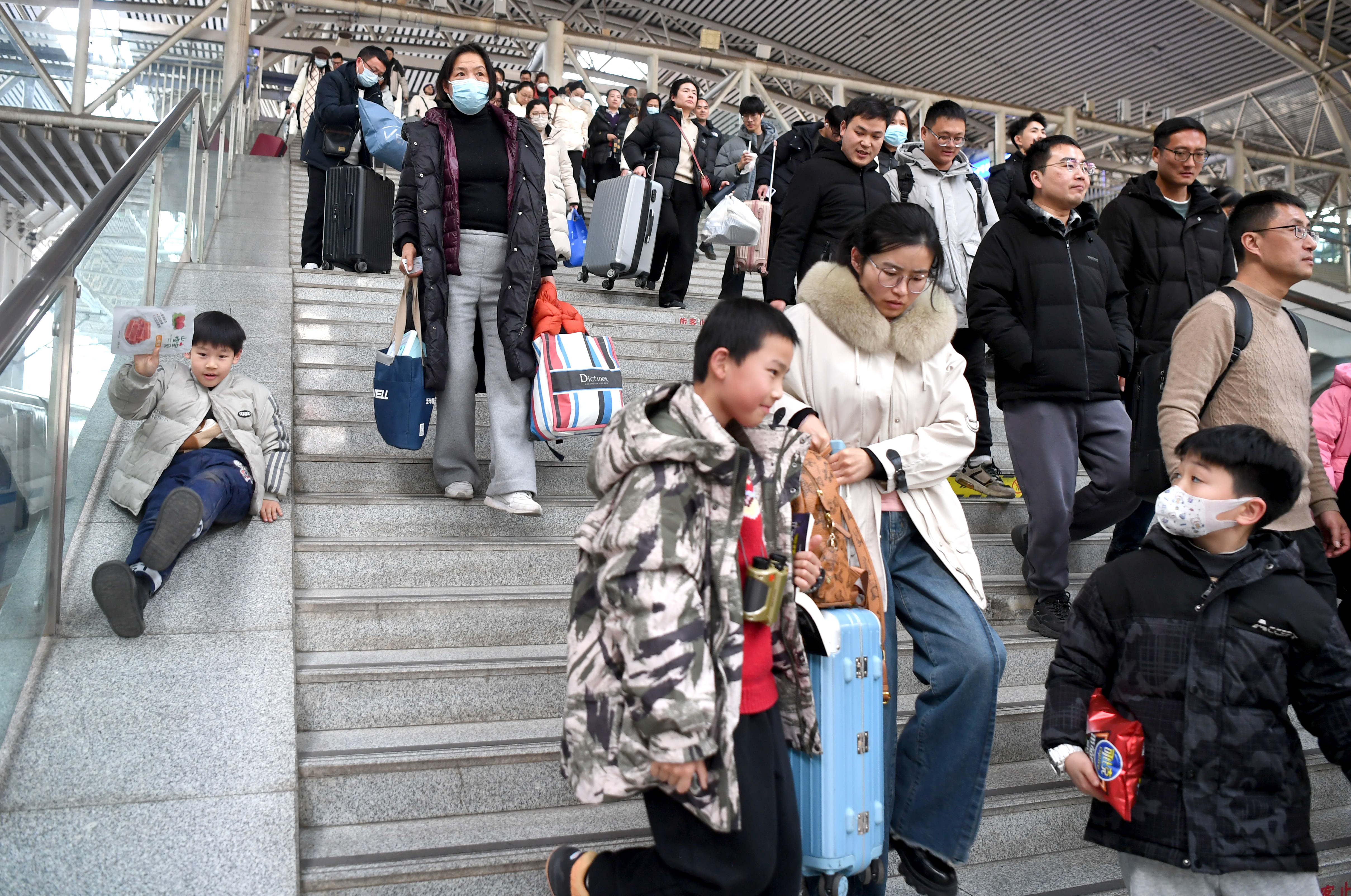 2025年1月13日,大批旅客在南京火车站乘车返乡。2025年蛇年春运从1月14日开始,到2月22日结束,为期40天。今年春运,全社会跨区域人员流动量将达90亿人次,被指称为“人类史上最大规模的迁移”,其中,全国铁路发送旅客有望突破5.1亿人次,日均1275万人次,较去年春运增长5.5%。 新华日报·交汇点记者 郎从柳摄