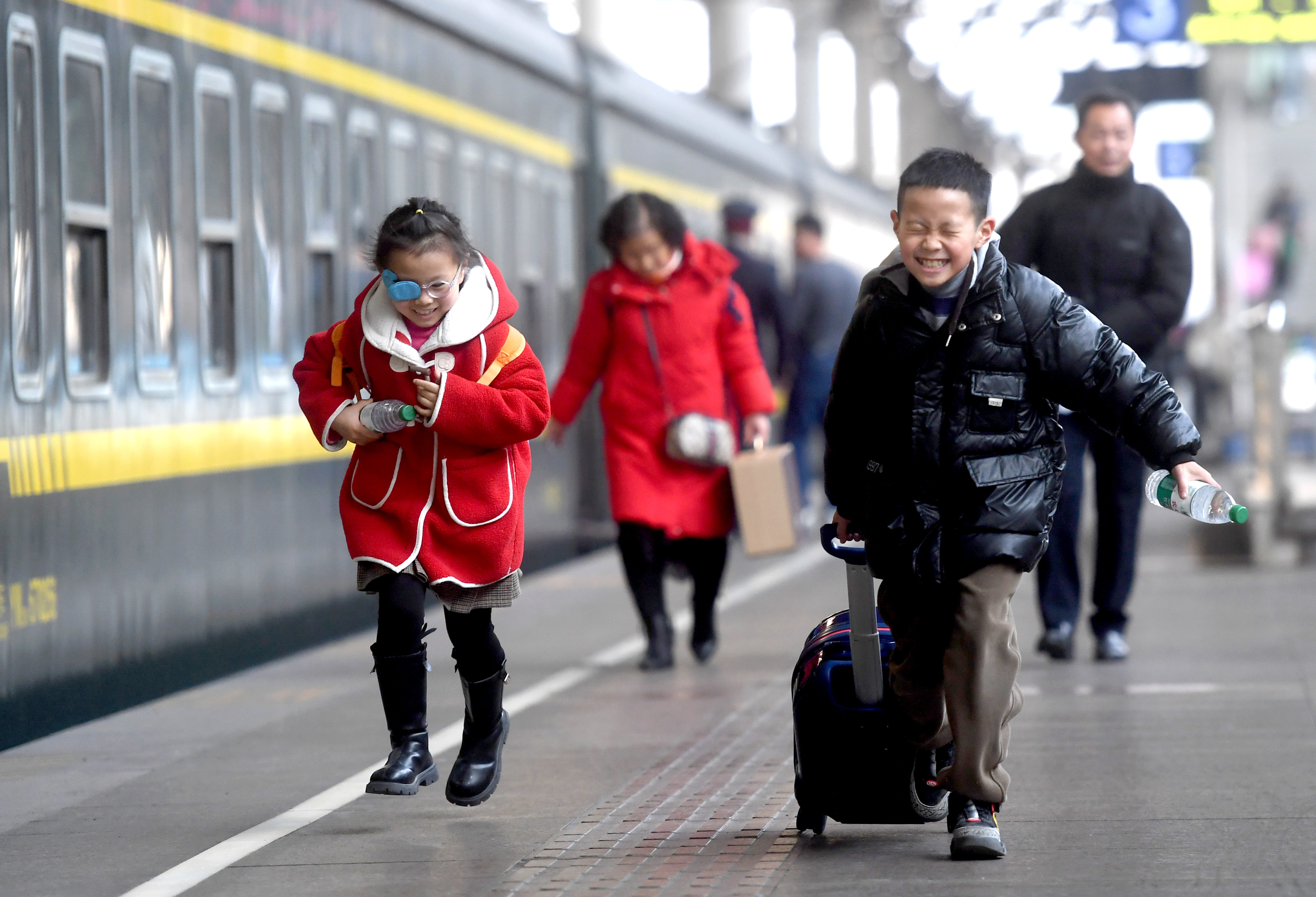 1月13日,两名旅客在南京火车站奔跑着赶乘列车。 新华日报·交汇点记者 郎从柳摄