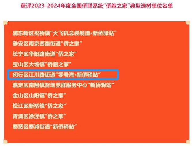 近日,中国侨联通过了《关于确定2023—2024年度全国侨联系统基层组织及“侨胞之家”典型选树单位的决定》。上海市共有8个基层组织和10个“侨胞之家”位列其中。闵行区江川路街道“零号湾•新侨驿站”获评2023—2024年度全国侨联系统“侨胞之家”典型选树单位。