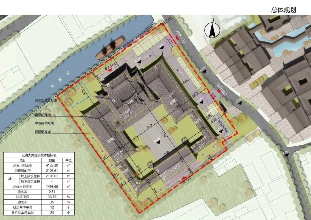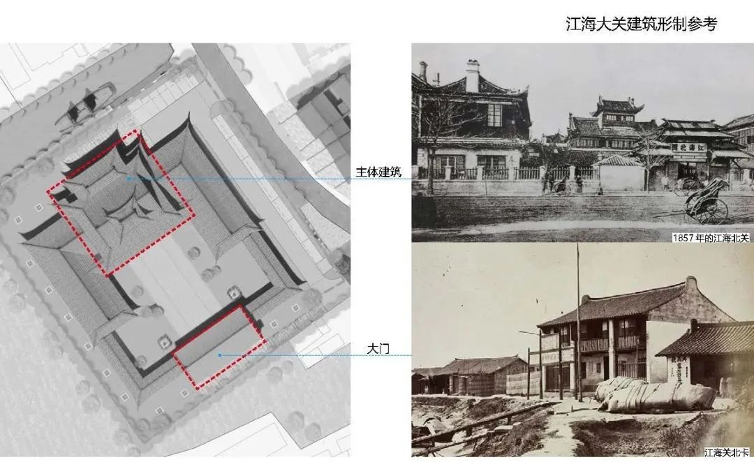 为重现江海关昔日风采,江海关项目主体建筑以新建仿古手法,“主体建筑参照1857年的江海北关形象进行设计,大门建筑参照江海关北卡(光绪《上海县续志》)中的形象。”项目负责人韩晨介绍道,为了尽可能还原康熙年间江海关办公原址风貌,项目在设计之初就遍查历史、方志等,还参考了清代绘画作品中保留的江海关形象,力图有史可依。