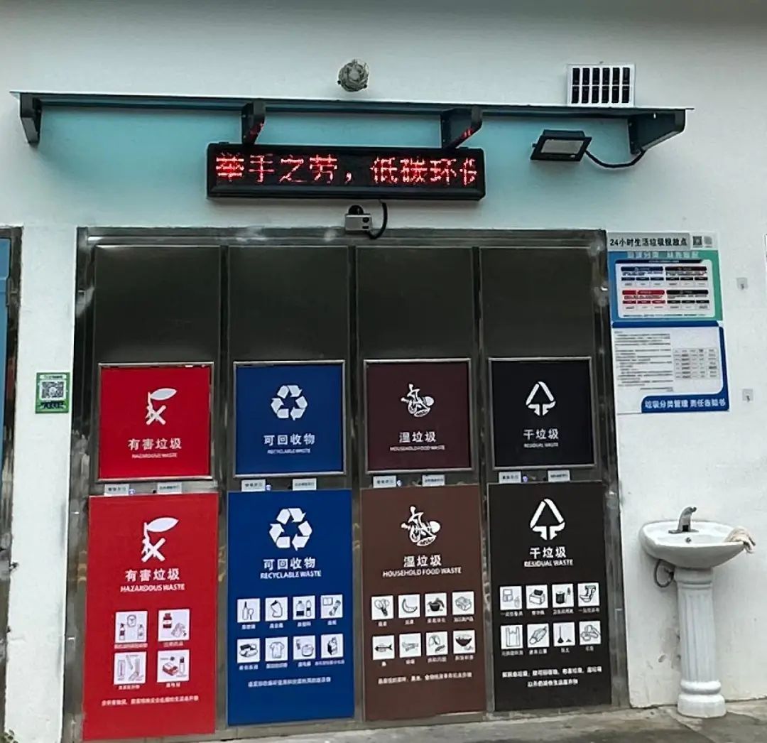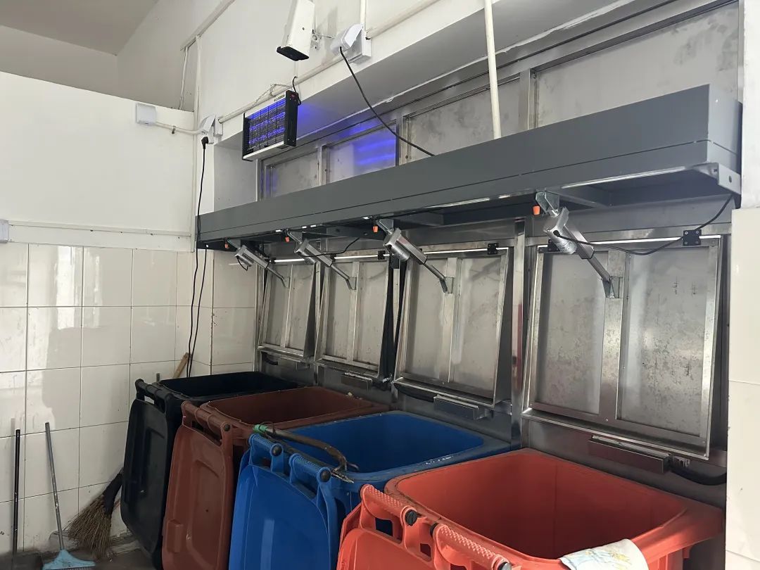 此外,垃圾箱房内部配套了杀虫灯、自动喷淋除臭装置、嵌入式的排风扇等,进一步提升整体设施的智能化和舒适度。