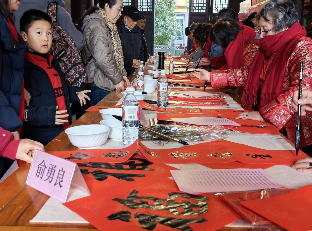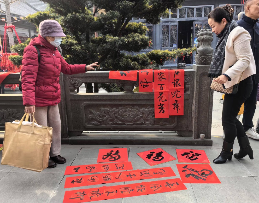 随着春节的临近,上海宁国禅寺与上海市徐汇区书画协会共同举办了第九届“把福带回家”公益文化活动。40位来自徐汇区书画协会的书法家在宁国禅寺齐聚一堂,为前来参观的市民和游客书写春联和“福”字,以此来传递节日的喜庆与祥和。