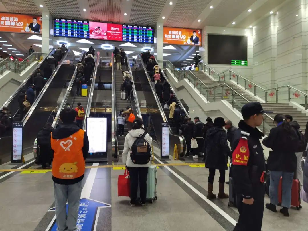 在车站候车室的通道,洋溢着浓浓的年味,随处可见拎着大包小包回家过年的旅客。候车室内,铁路民警加强了安全巡查,提醒旅客注意财物安全。