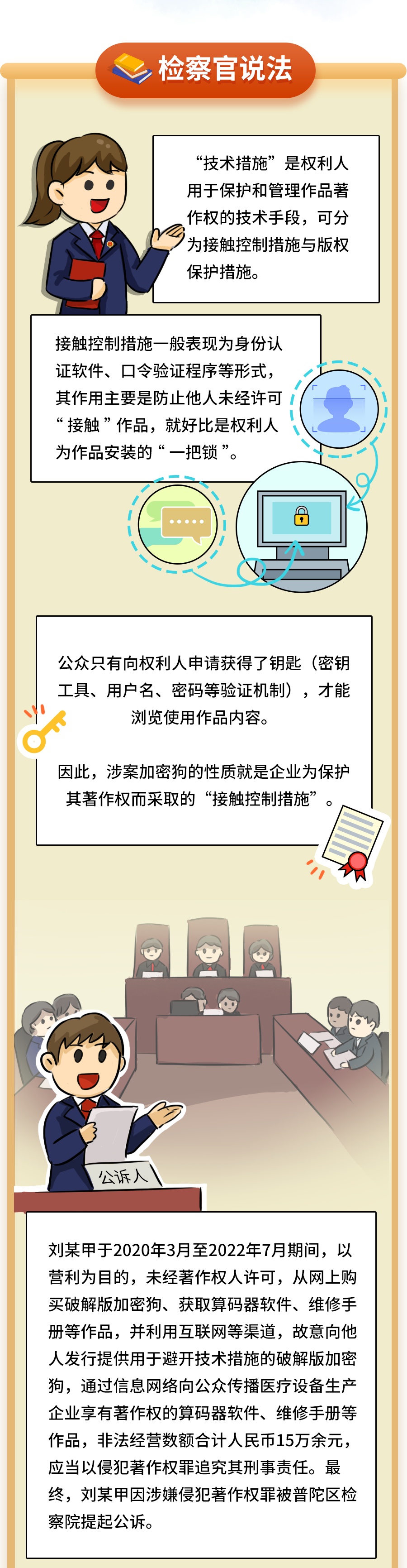 检察机关积极回应著作权技术措施等新技术、新样态的现实法治需求,会同市版权协会等单位发布企业数字版权技术措施保护指引,支持、鼓励权利人健全数字版权保护体系,促进技术措施发展应用,提示可能存在的安全漏洞,做实对知识产权全生命周期保护,护航新质生产力培育发展。