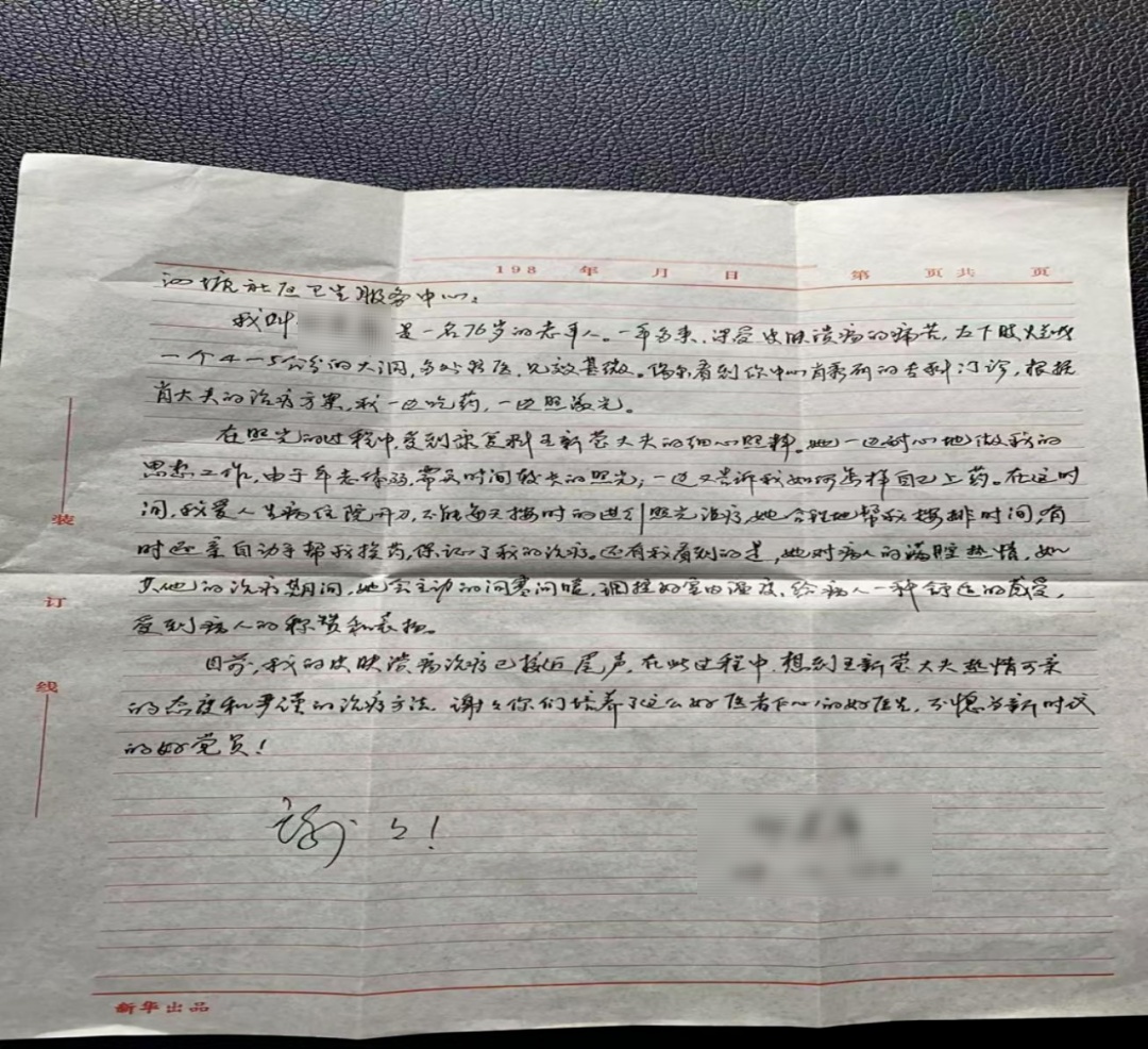 对此,何阿姨满怀真诚地写下一封感谢信——感谢泗塘社区卫生服务中心引进上级医院皮肤科专家下沉社区服务百姓,也感谢康复科团队医务人员专业细致的治疗。