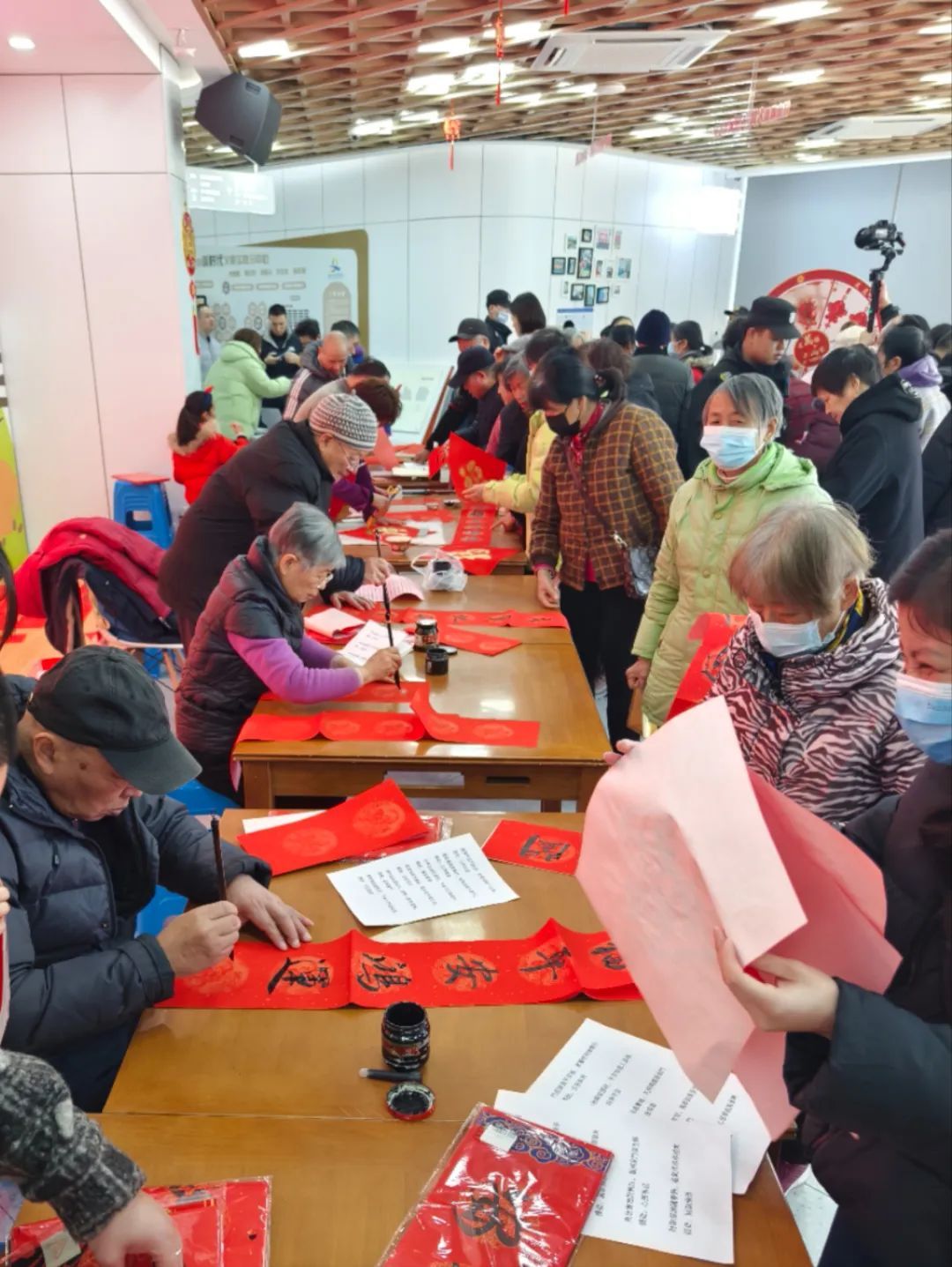现场格外热闹,记者看到,大家围在长案前认真挑选心仪的联句,8位职工书法爱好者、劳模书法爱好者则端坐在长桌另一侧,正神情专注地挥毫泼墨,写下一幅幅春联、福字,为居民朋友送上迎新贺礼。