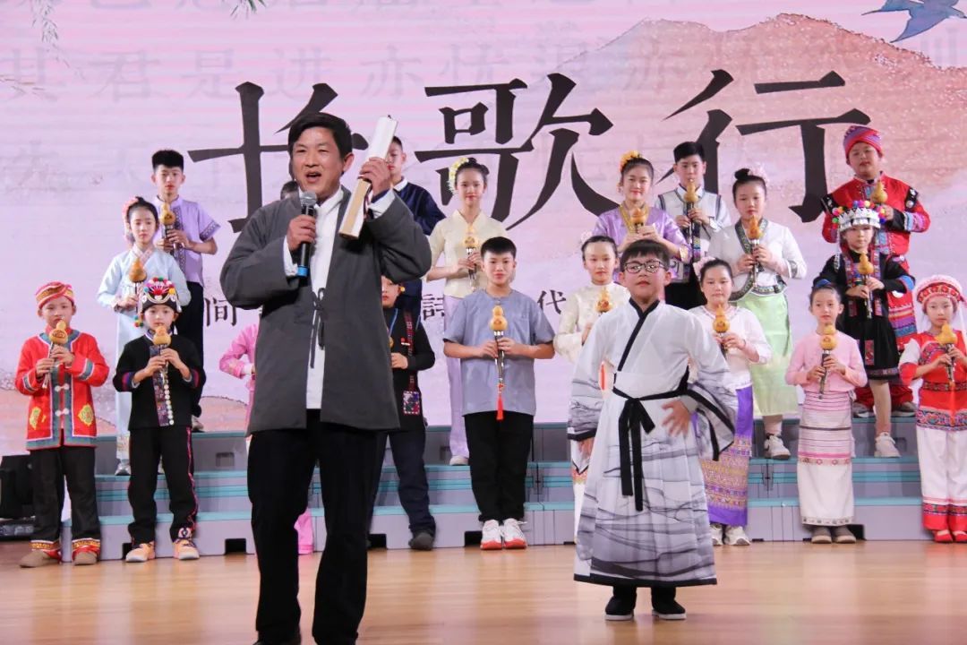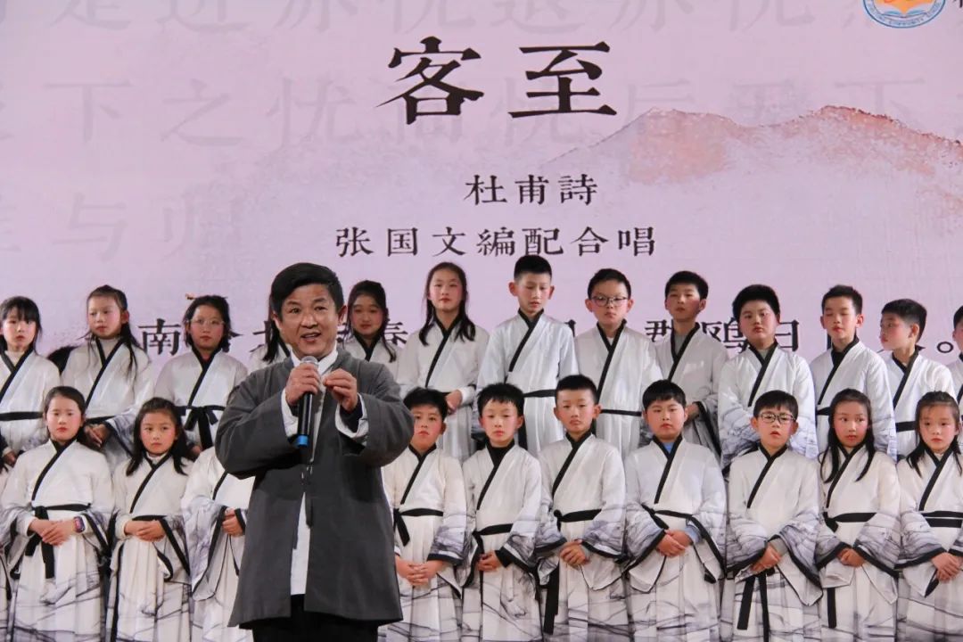 “花径不曾缘客扫,蓬门今始为君开……”音乐会以唐代杜甫的《客至》拉开帷幕,身着汉服的孩童与老人携手登台。衣袂飘飘间,稚嫩清脆的童音与老者沧桑浑厚的声音在场上交织。从诗词合唱、情景式吟诵,到乐器演奏、情景剧,表演曲目多达13个,古诗词名篇《长歌行》《出塞》《钗头凤》等均在其列。其中,既有老少合作节目,也有老年合唱团与童声合唱团各展风采的节目。参演人员既有松江本地的九里亭外国语实验学校、九里亭社区(老年)学校的师生,又有远道而来的云南省西双版纳州允景洪小学和安徽省六安市人民路小学、人民路小学南山校区、人民路小学安丰路校区的师生们。