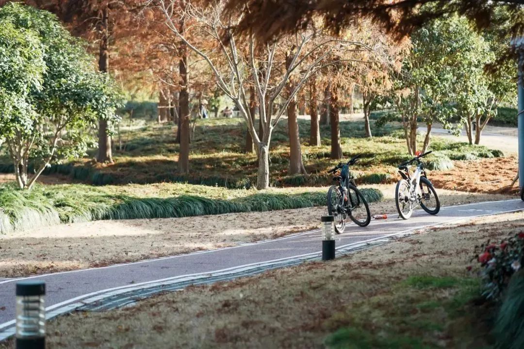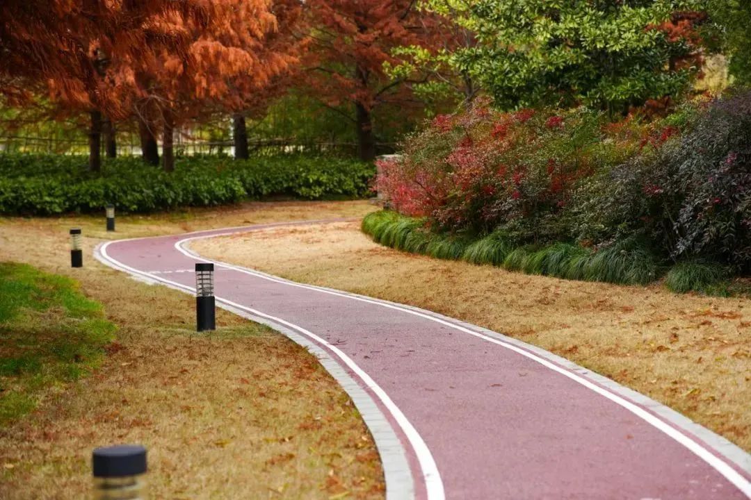 虹桥体育公园市民健身步道的新建计划启动于2023年。目前建成的一号步道以暗红色为主基调,与周围的植物、绿地、竹林等景观相映成趣,形成了一幅秀美怡人的画卷。步道材质采用了彩色透水混凝土,不仅防滑,还能有效保障市民运动时的舒适与安全。