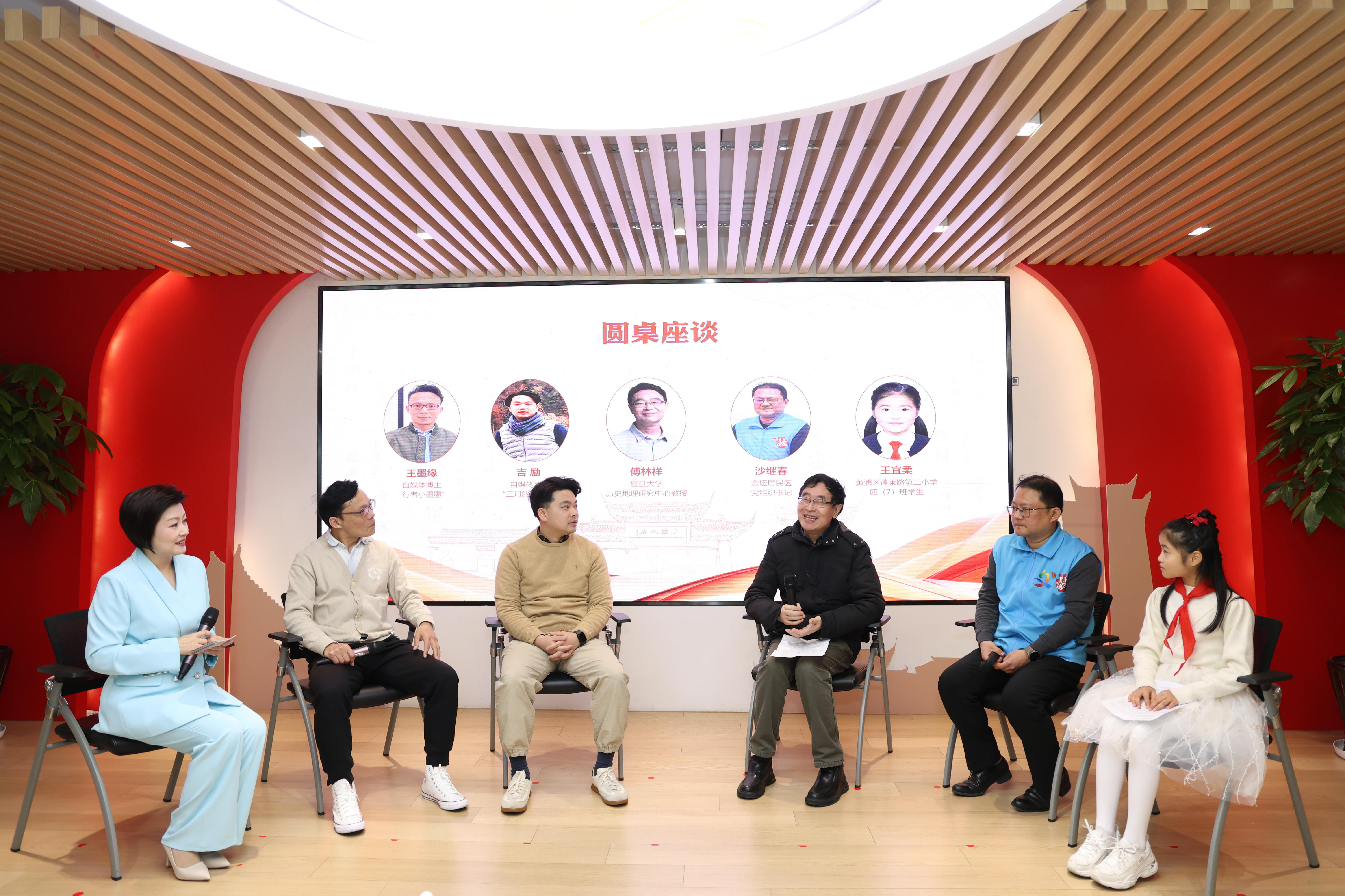 在圆桌座谈环节,复旦大学历史地理研究中心教授傅林祥、小东门街道金坛居民区党总支书记沙继春、自媒体博主“行者小墨墨”王墨缘、自媒体博主“三月的斋卤味”吉励以及黄浦区蓬莱路第二小学四(7)班学生王宜柔应邀参加,共同探讨地名文化的价值与传承之道。