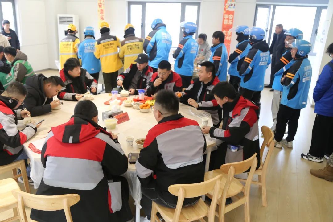考虑到中午是大家工作的高峰时段,因此,热气腾腾的饭菜10点就已经准备妥当,大家有序排队,挑选可口的食物,一起围坐在大圆桌上畅享团圆饭。“饭菜很香,还领到了很多小礼品,感觉很温暖。”叮咚买菜广富林站点的魏松告诉记者,为了保障春节期间的配送运力,叮咚买菜广富林站点有20多名配送小哥选择坚守岗位,让居民过年期间可以安心买菜,及时收货。