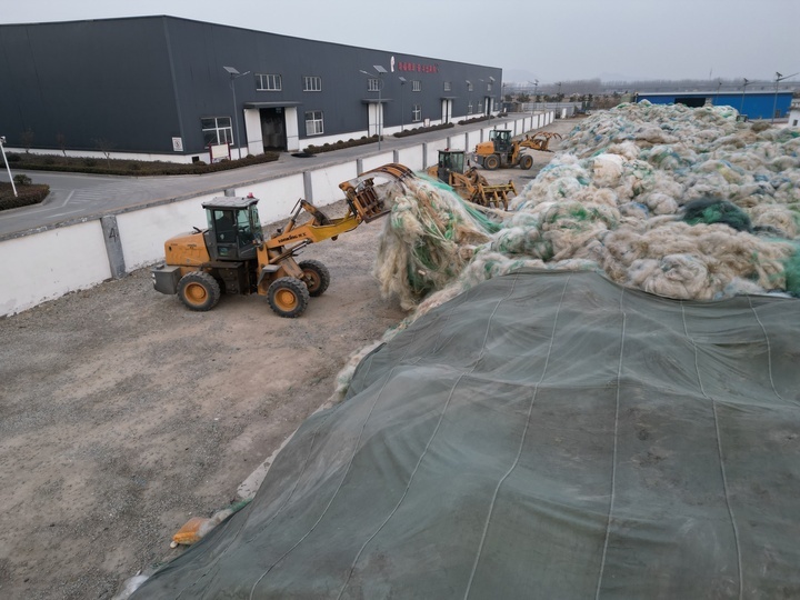 交汇点讯 “过去一年,我们平均每天回收60万斤废旧渔网,这些渔网不仅有省内的,更多的来自全国沿海各地。”1月15日,在连云港市赣榆区柘汪镇西棘荡循环经济产业园运输场,连云港永泰塑业有限公司总经理于刚向记者娓娓道来过去一年的“渔网变奏曲”。现场,几台叉车正开足马力“抓取”一堆堆废旧渔网,将它们有序地存放起来。