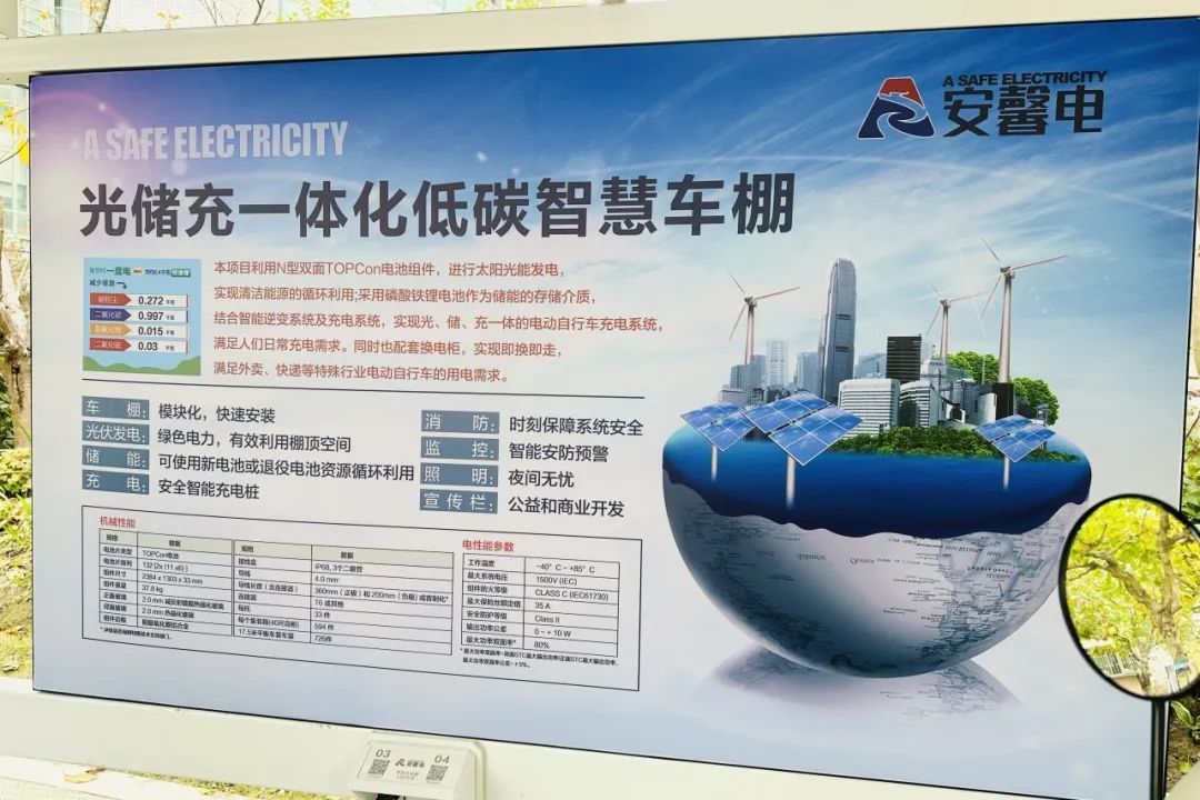 光储充智能技术加持,是该车棚的最大亮点。其供电原理极具创新,利用N型双面TOPCon电池组件,进行太阳光能发电,能够实现清洁能源的循环利用;采用磷酸铁锂电池作为储能的存储介质,结合智能逆变系统和充电系统,打造光、储、充一体化的电动自行车智能充电系统,满足人们日常充电需求。