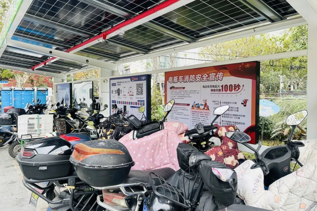 相较于传统的非机动车充电设施,“枫和暖杨”光储充智慧车棚不仅在充电功能上进行了创新,还在供电线路、防火预警、智能监控、防火宣传、使用缴费等方面实现了全面升级。
