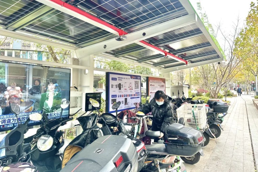 “枫和暖杨”光储充智慧车棚位于商业活动频繁、人流较为密集的桂巷坊步行街,设有20个充电插口,能够同时满足20辆非机动车的充电需求。