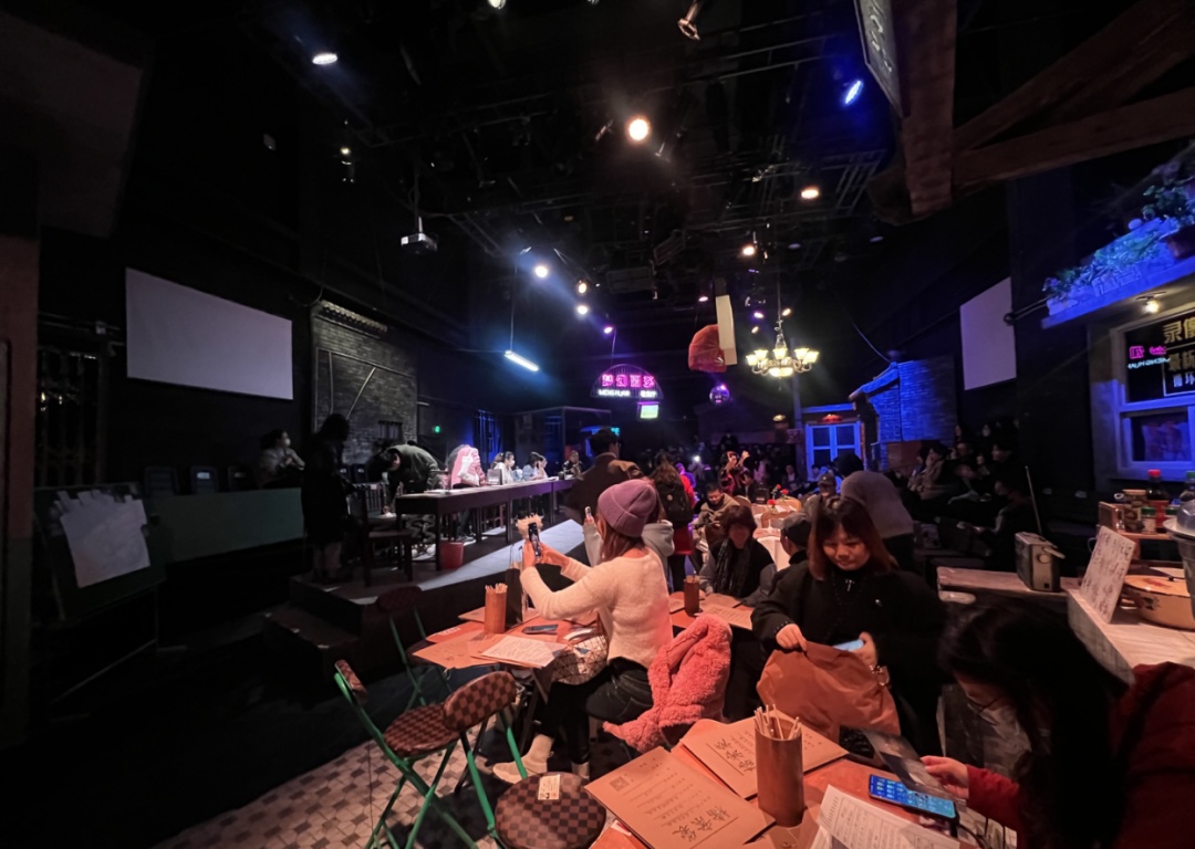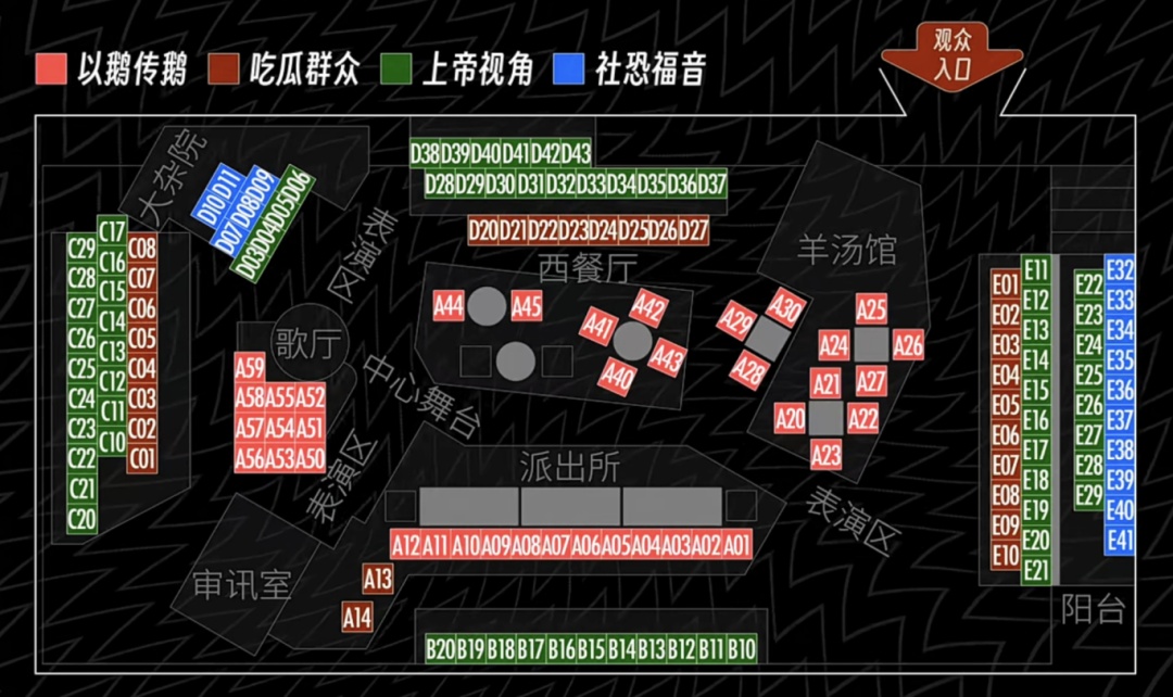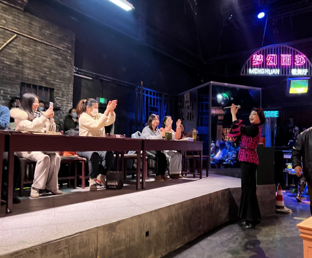 剧场由一条二十多米长的小巷贯穿,三四百位观众沿着步道错落分布在不同区域中参与演出。有的在西餐厅红白格子四方桌落座,这里能近距离看好几场推进剧情的对手戏;有的在长条桌上落座,这里可以和主演一起讨论案情;有的坐在歌舞厅高脚椅上一起和演员高声唱歌打拍子……不同座位还有着不同的身份卡,让观众可以在不知不觉中融入剧情,体验到更细节、更有层次的真实感。