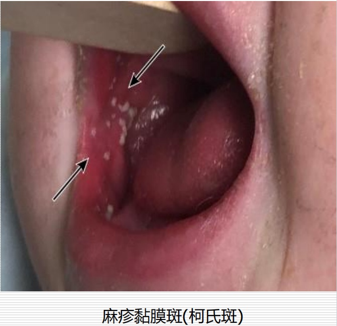 前驱期(出疹前期):一般2-4天。主要表现为发热、流涕、喷嚏、咳嗽、上呼吸道症状及流泪、畏光、眼结膜炎等症状。起病后2-3天口腔出现麻疹黏膜斑(柯氏斑),具有临床诊断意义。