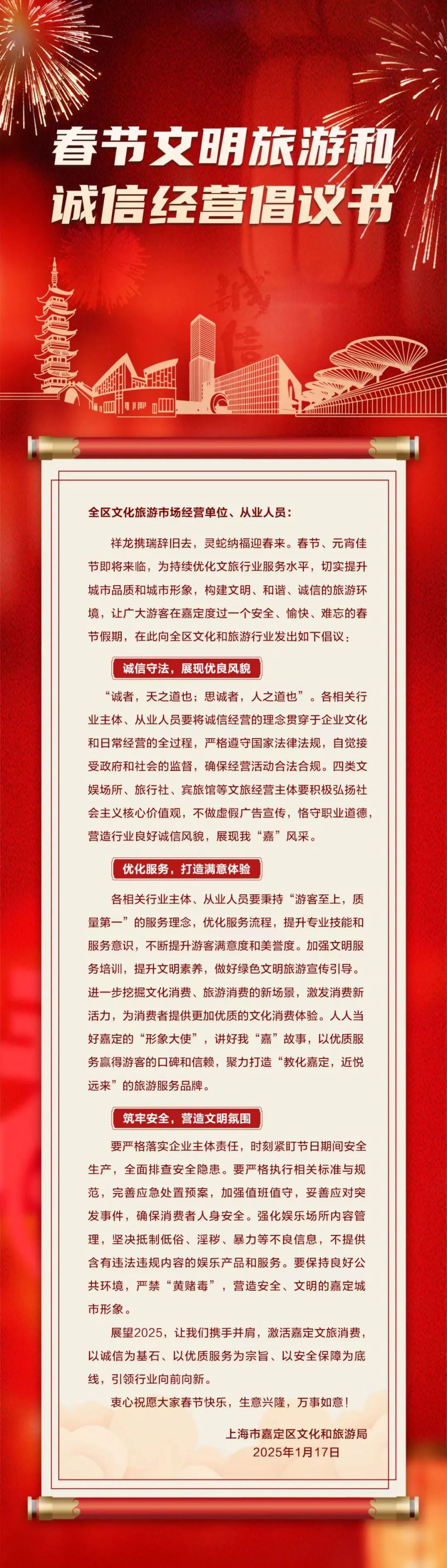 @嘉定人,这里有一份春节文明旅游和诚信经营倡议书,请查收~
