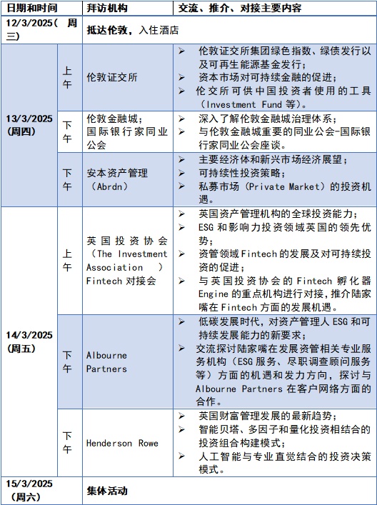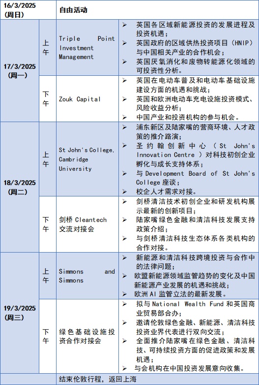 因此,陆家嘴金融城计划于2025年3月隆重推出第七期双城合作交流项目。本期将延续以绿色金融、新能源、清洁科技及可持续投资为核心主题,同时,更为聚焦中英双方在相关领域的现实合作机遇,通过与英国重要机构及行业组织的深度互动,为双方行业参与者创造更多协同发展的契机。