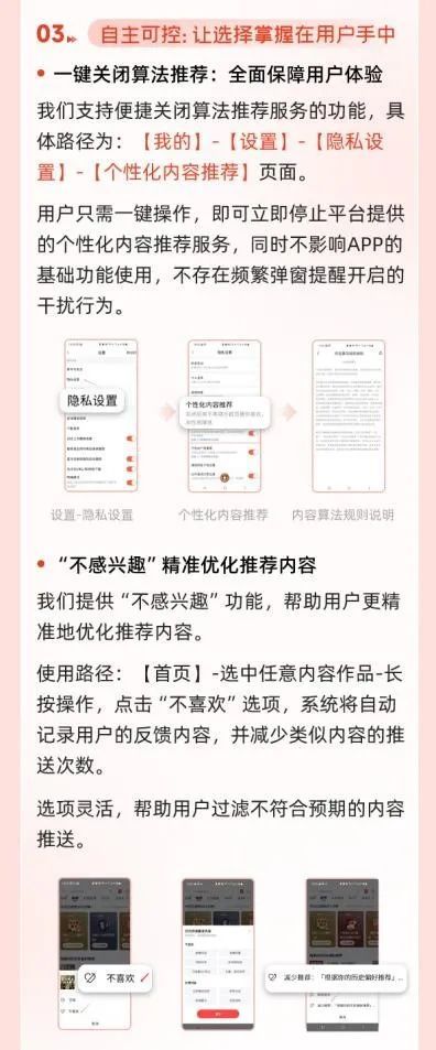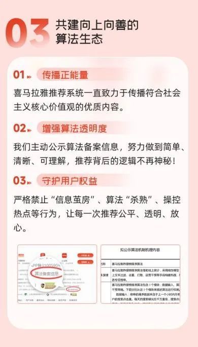 会议指出,依据《互联网信息服务算法推荐管理规定》,网站平台在提供个性化推荐算法服务时,要坚守算法导向正确、自主可控原则。要健全正能量优质内容池,综合运用扶优打差、打散干预、算法遗忘等多元策略,提升推荐内容优质性、多样性、拓展性。要持续优化面向未成年人、老年人的算法服务,有效防范用户沉迷、过度消费等问题。要加强用户权益保护,不得超范围收集用户个人信息用于内容推荐;确保用户能便捷关闭算法推荐服务;支持用户通过“不感兴趣”按钮、兴趣标签管理等功能,自主调节推荐内容类别,真正把“算法开关”交到用户手中。