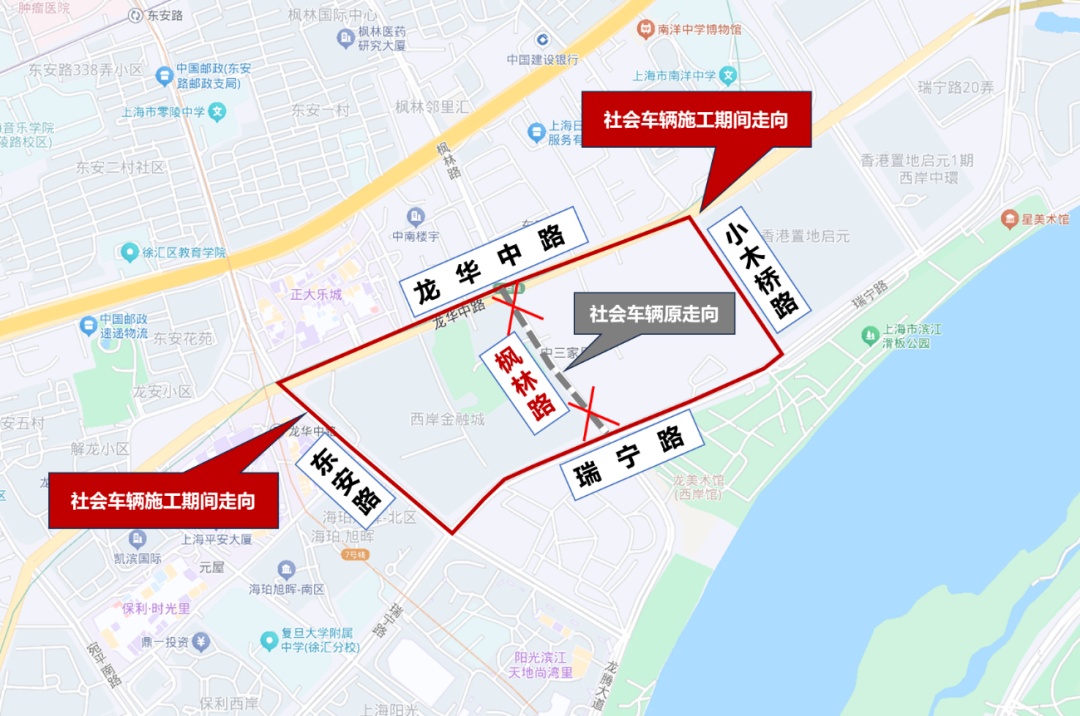为配合徐汇区西岸金融城DE街坊大联通施工建设,受基坑开挖及围护的影响,枫林路(龙华中路—瑞宁路)段不具备维持通行条件。自2025年1月17日12时起,枫林路(龙华中路—瑞宁路)采取全天禁止行人、机动车、非机动车双向通行的施工期间管理措施。施工期间,途经施工路段的滨江2路、徐汇滨江环线公交将通过东安路改道运行。
