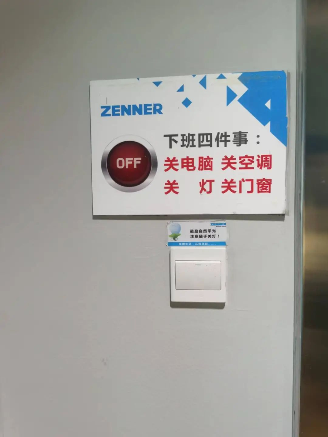 人人都是绿色发展践行者,在办公区域,节能“小妙招”随处可见。空调加装了小风扇,不仅能省电,还能加快室内空气流动。到了饭点,办公区域的灯会自动熄灭。智慧食堂让员工自主选择菜品,减少食物浪费,为倡导光盘行动,系统可通过人脸识别给予光盘员工积分奖励。食堂内还有垃圾分类监控系统。电梯按钮上方的标语提醒员工下班四件事:关电脑、关空调、关灯、关门窗。