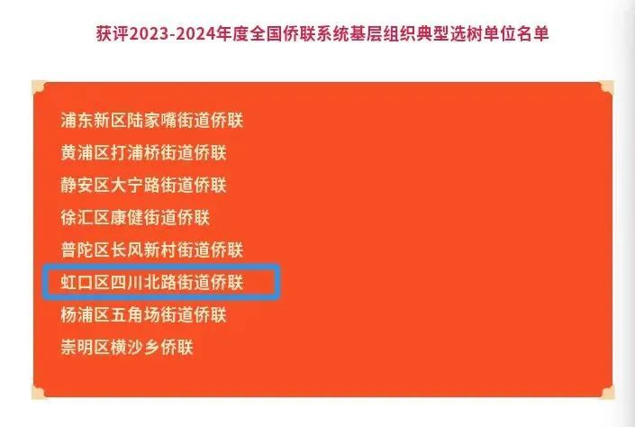 近日,中国侨联公布了2023-2024年度全国侨联系统基层组织及“侨胞之家”典型选树单位名单,四川北路街道侨联荣登榜单。