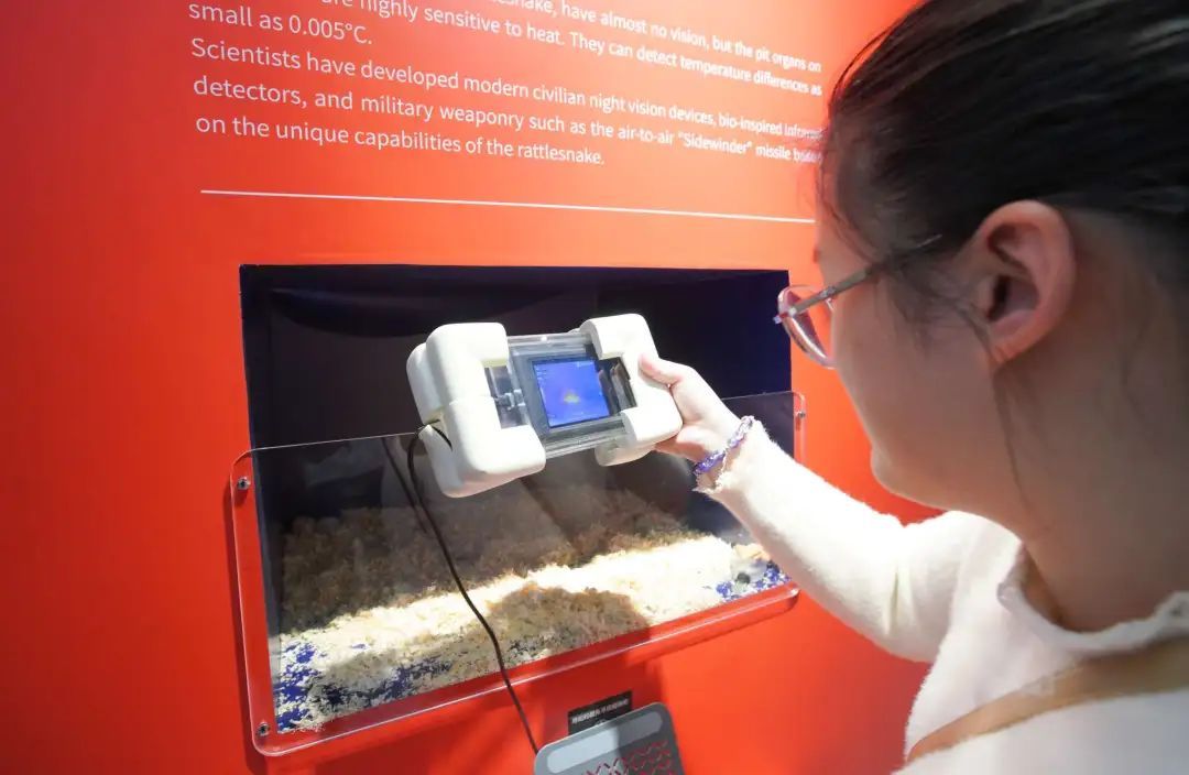 在现场的沉浸式互动装置“红外热感互动体验”前,观众可以感受蛇类捕猎时对温度变化的敏感性。“仿生蛇互动”项目通过仿生蛇的动态演示揭示蛇类运动的独特魅力。
