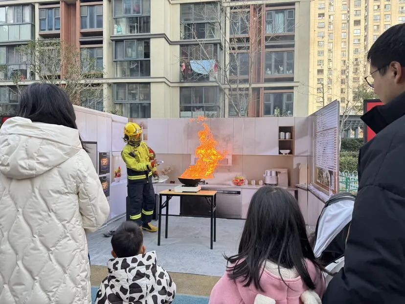消防员还把kt板做的模拟厨房搬到了现场,消防员通过点燃油锅,直观地向居民展示了油锅起火的正确处置方法。他首先尝试用水浇灭,结果火势反而更加猛烈,随后他示范了使用锅盖盖住油锅隔绝氧气从而灭火的有效方法。
