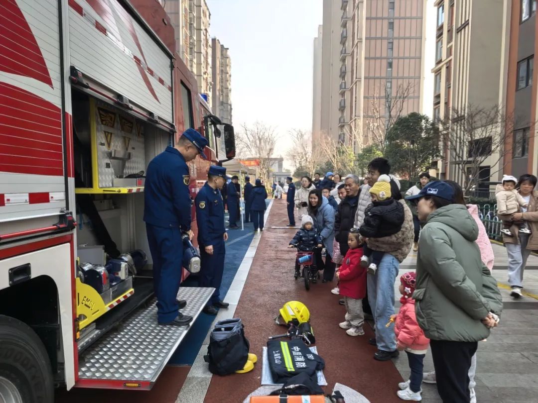 在宝山区杨行镇四季都会小区,火红的大型消防车成为现场焦点,吸引了众多居民驻足观看。小朋友们不仅有机会近距离接触各类消防设备,还能乘坐消防车看到内部构造。