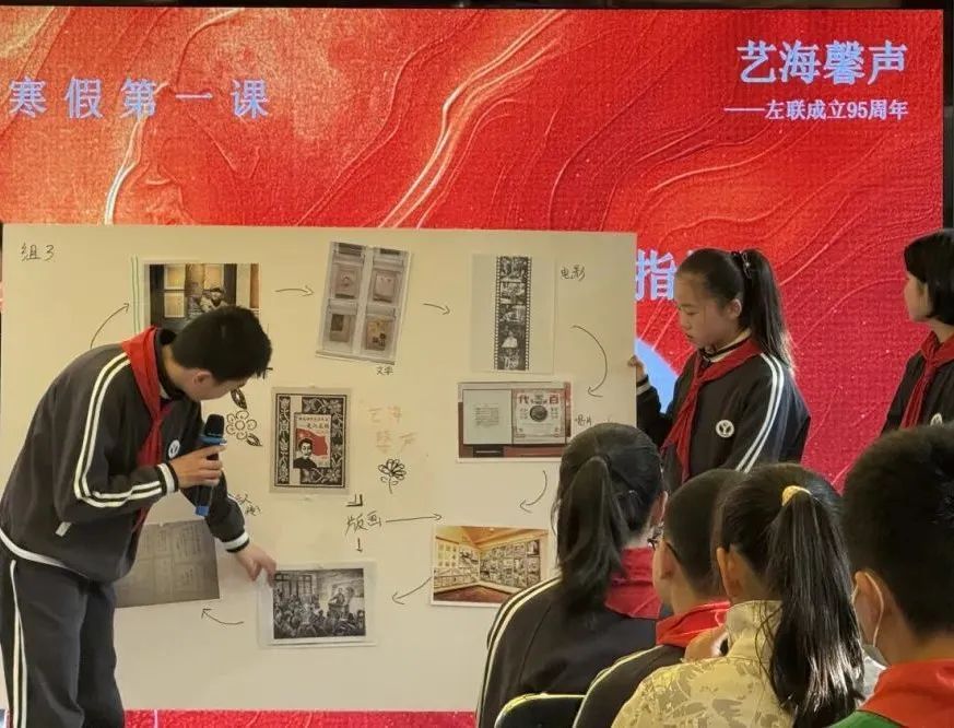 本次寒假第一课以“艺海馨声”为主题,以展示“左联的艺术美”为切入口,以嘉宾老师带领学生组合图片的方式,合作完成一份“左联风采”导览路线设计图。