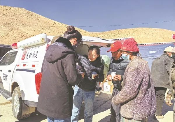 1月10日,定日法院干警驱车30多公里,前往曲洛乡措娃村支援。该村是此次受灾严重的地区之一,干警抵达临时安置点后将热茶分给村民,并参与后续安置工作。