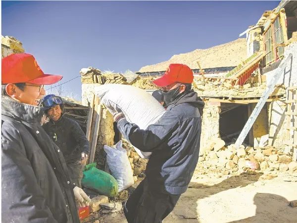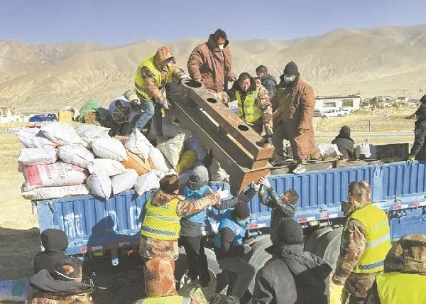 1月13日,定日法院驻措娃村干警帮助群众转移财产,为重建做准备。该村所有建筑都存在不同程度损毁,为了尽量减少财产损失,干警将青稞等具有经济价值的农作物转移到安置点的板房。