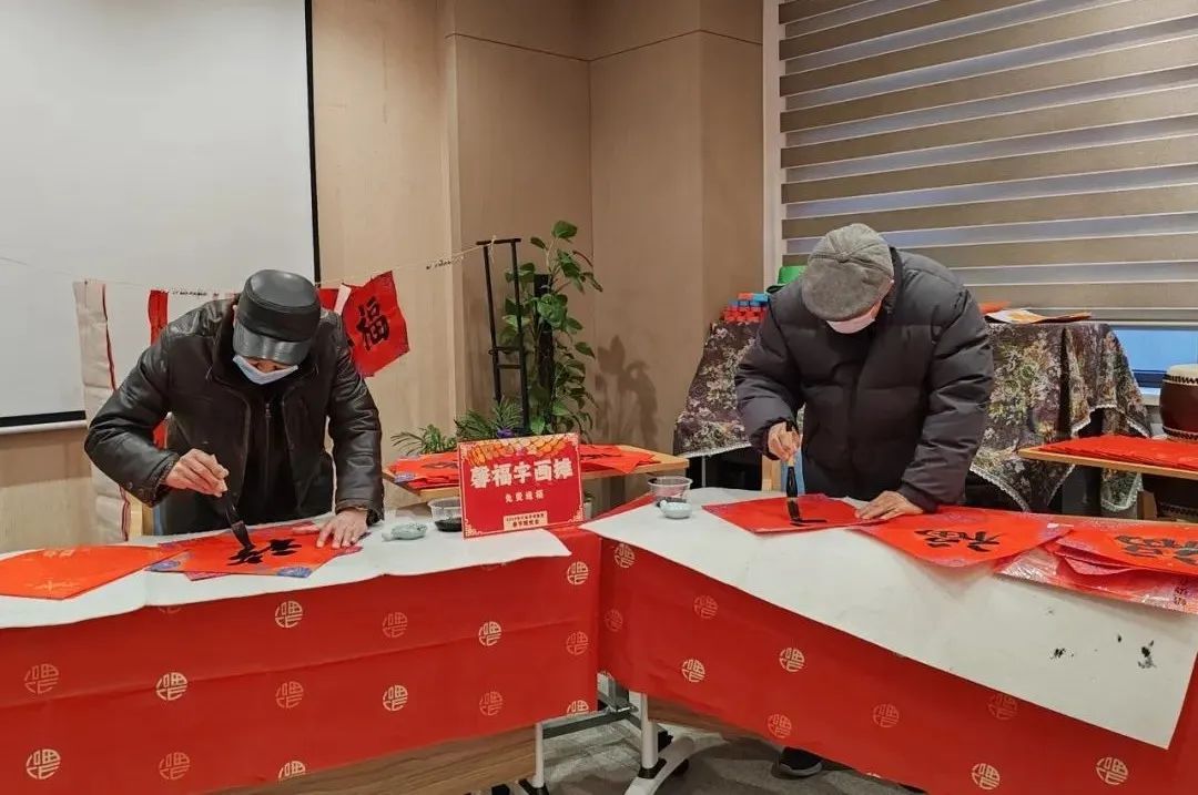 在摊位上挥毫泼墨的,同样是生活在养老院的老人。今年80岁的曹爷爷虽然行动稍显迟缓,但写起书法一点不含糊,不仅运笔行云流水,字体也刚劲有力,很难想象他刚来养老院时,只能靠身上插着的鼻饲管和导尿管生活。如今,在护理员的精心照顾下,曹爷爷通过康复训练,不仅可以自行行走,还能参加每周二的书法练习活动。“我喜欢书法很多年了,今年能给养老院的同伴们写福字,很开心。”曹爷爷缓缓地说道。