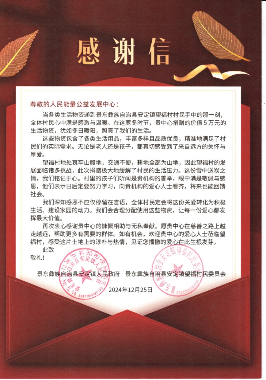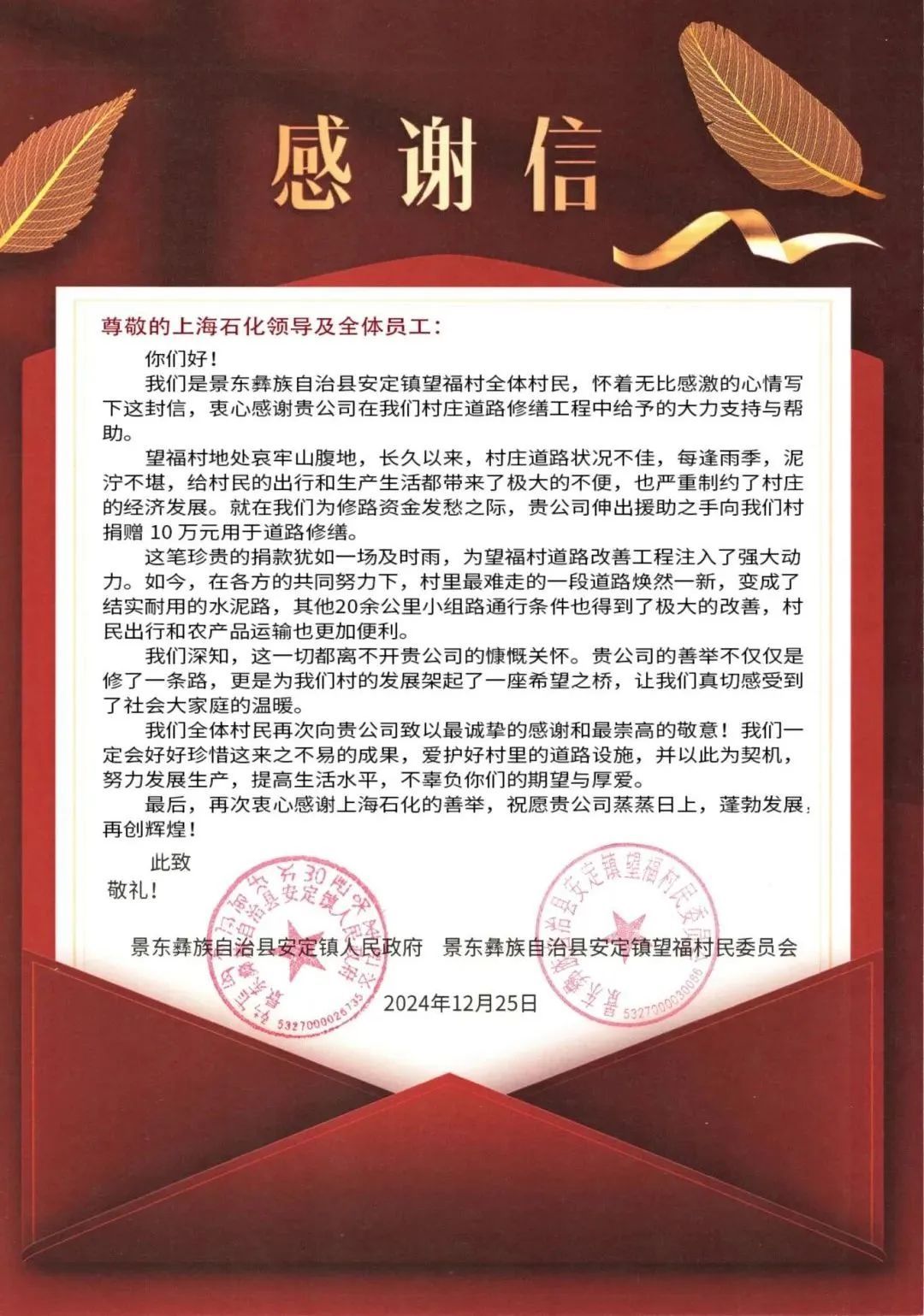 近日,云南省普洱市景东县安定镇望福村相关负责人将两封情意满满的感谢信交给来自上海市金山区的援滇干部手中,由他们转达对爱心企业的感谢。原来,在上海援滇干部和普洱市农业农村局帮助下,通过沪滇协作,2024年,望福村迎来了一批饱含深情的爱心捐赠,中国石化上海石油化工股份有限公司(以下简称上海石化)慷慨捐赠10万元用于村庄道路修缮,人民能量公益中心捐赠了价值5万元的生活物资。