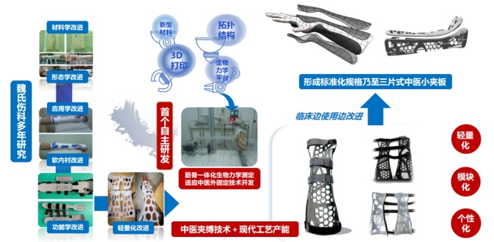 为了促进中医小夹板的发展及应用,项目团队历经十余年研发,融合国家非遗魏氏伤科软硬夹板理念,结合现代科技前沿技术,引进结构拓扑优化、有限元分析、3D打印、碳材料等先进技术,首创“筋骨一体化”生物力学测定平台,成功研发出符合人体工学的个性化、轻量化夹板及标准化“塞规”系统。阐释了小夹板材料、结构和应用标准等科学问题,为骨伤科的创新发展注入新动力,开创中医夹缚技术研究的新局面。
