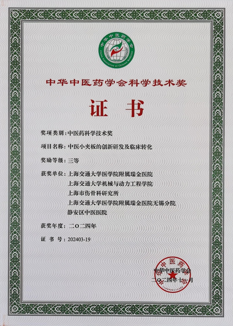 近日,2024年中华中医药学会科学技术奖评选结果公布,我院魏氏伤科上海市代表性传承人、伤科主任奚小冰领衔的成果《中医小夹板的创新研发及临床转化》荣获中华中医药科学技术奖三等奖。