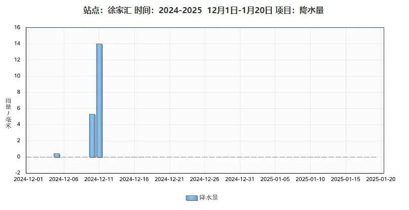 自2024年12月12日至今,徐家汇站已连续40天没有雨水出现,打破了历史同期最长无降水纪录(12月至1月)。