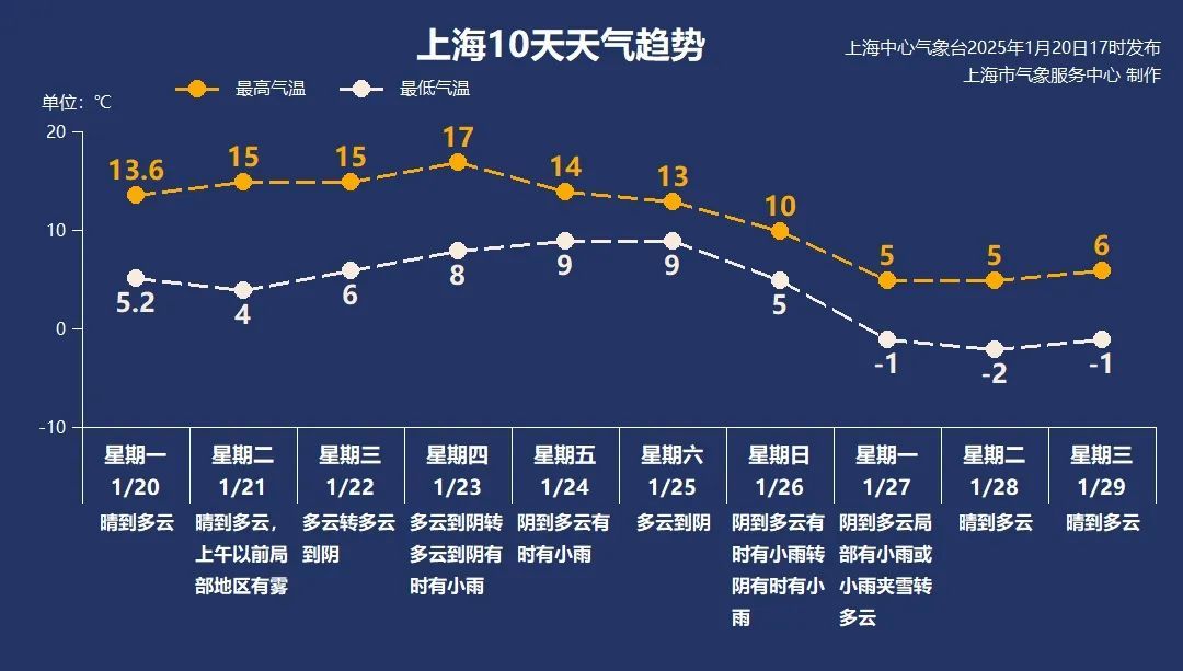 上海周三和周四还是多云为主的天气,回暖状态持续,周四的最高气温甚至可以迈向17℃。从过去10年的气象资料来看,有三年出现过1月下旬日最高气温≥17℃的情况,其中2017年甚至达到了21.5℃。