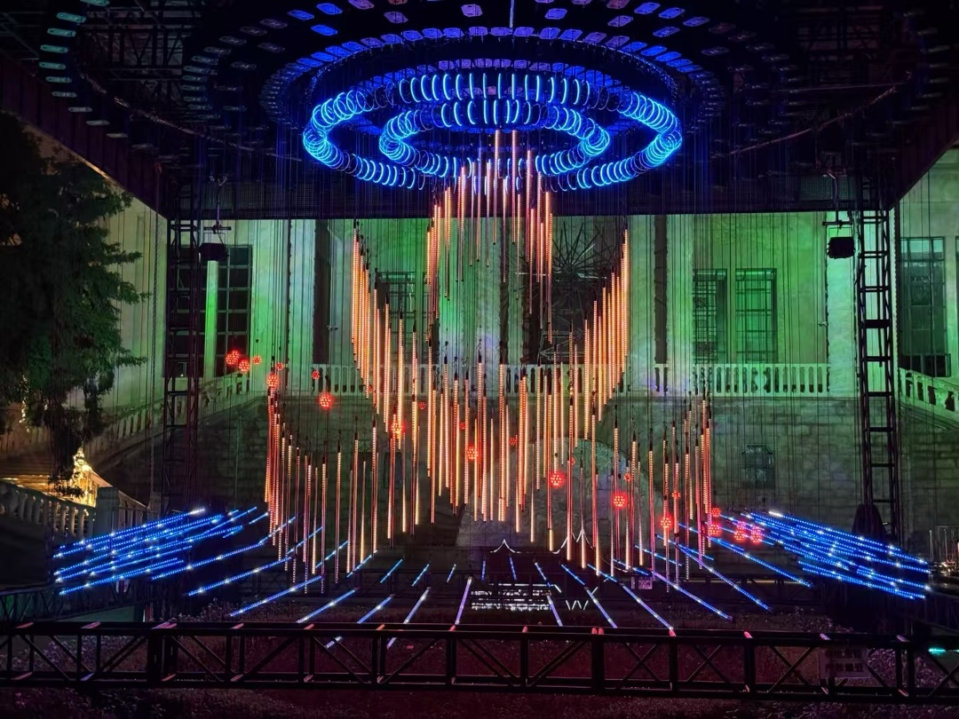 作为由高端数控技术打造的动态光雕,《光之舞》装置采用升降系统与像素LED元素的结合,8个圆环层层相呼应,360度发光设计的LED灯条,让观众无论从哪个角度都能欣赏到绚丽的光影效果。