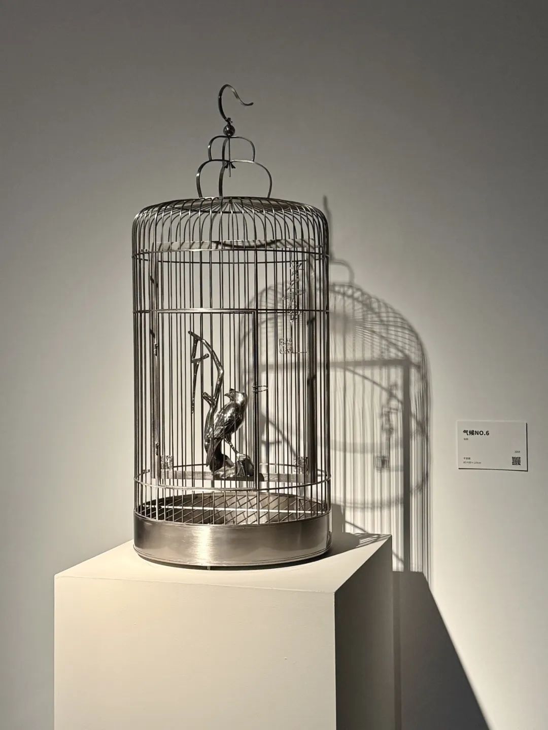 文人画,是中国重要的本土文化资源,于山水、花鸟等自然物象中寄兴托志、抒情达意,以抒发个人“性灵”。张新此次参展的作品《气候NO.6》,采用不锈钢,对八大山人空灵孤绝的绘画作品,进行了一次立体的转换,并将之放置在一个同样是不锈钢材质制作的鸟笼中,以此来表达她对于自然生态的一种深切的人文关怀。
