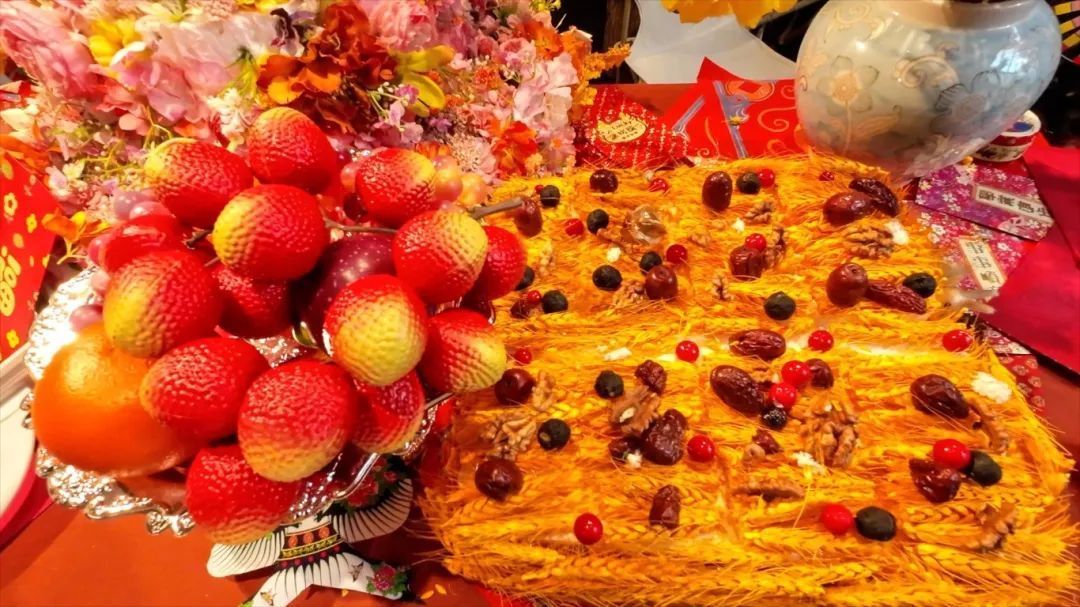 桌上有家宴,用花做的蛋糕、发糕等
