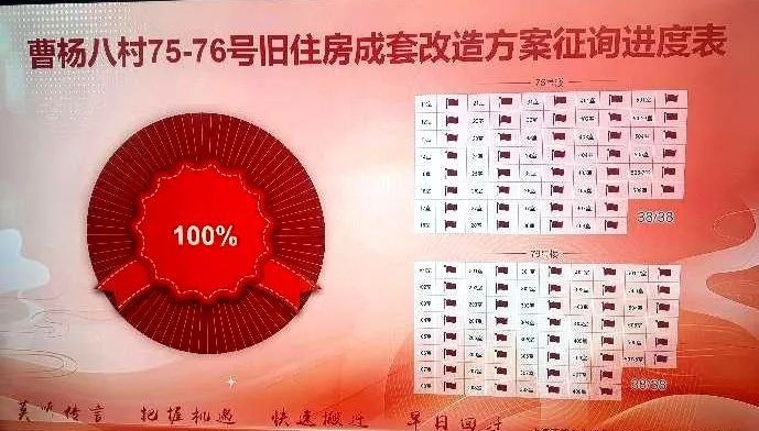 2025年1月19日,曹杨八村75-76号旧住房成套改造项目改造方案书面意见征询于当天获得100%居民认可!76户居民即将告别厨卫合用、走廊昏暗、逼仄狭小的居所,迎来品质宜居的美丽新家园!
