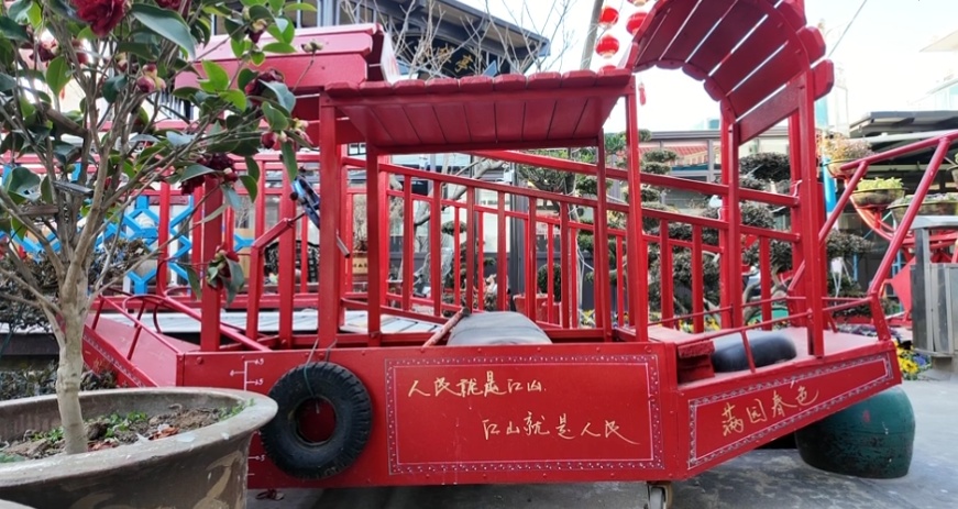 在民宿的宅前屋后,出自陆正昌之手的创意作品随处可见。2021年中国花博会的帆船花盆、巨型鸟笼、小水车等都是他的“得意之作”。尽管制作过程繁琐而辛苦,但陆正昌甘之如饴,享受着创造的乐趣。他还经常帮助左邻右舍修补家具,得到众邻的称赞。“我们有什么需要修补,他都会热心帮忙,从来不收钱。”邻居们纷纷夸赞。