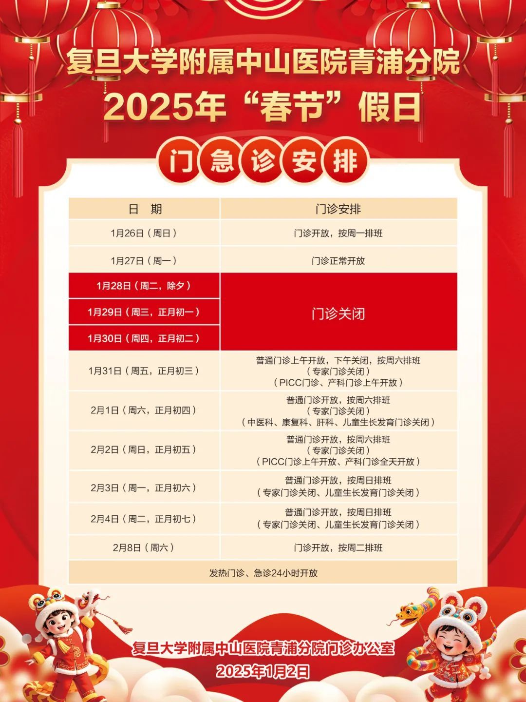 复旦大学附属中山医院青浦分院2025年春节假期门急诊安排
