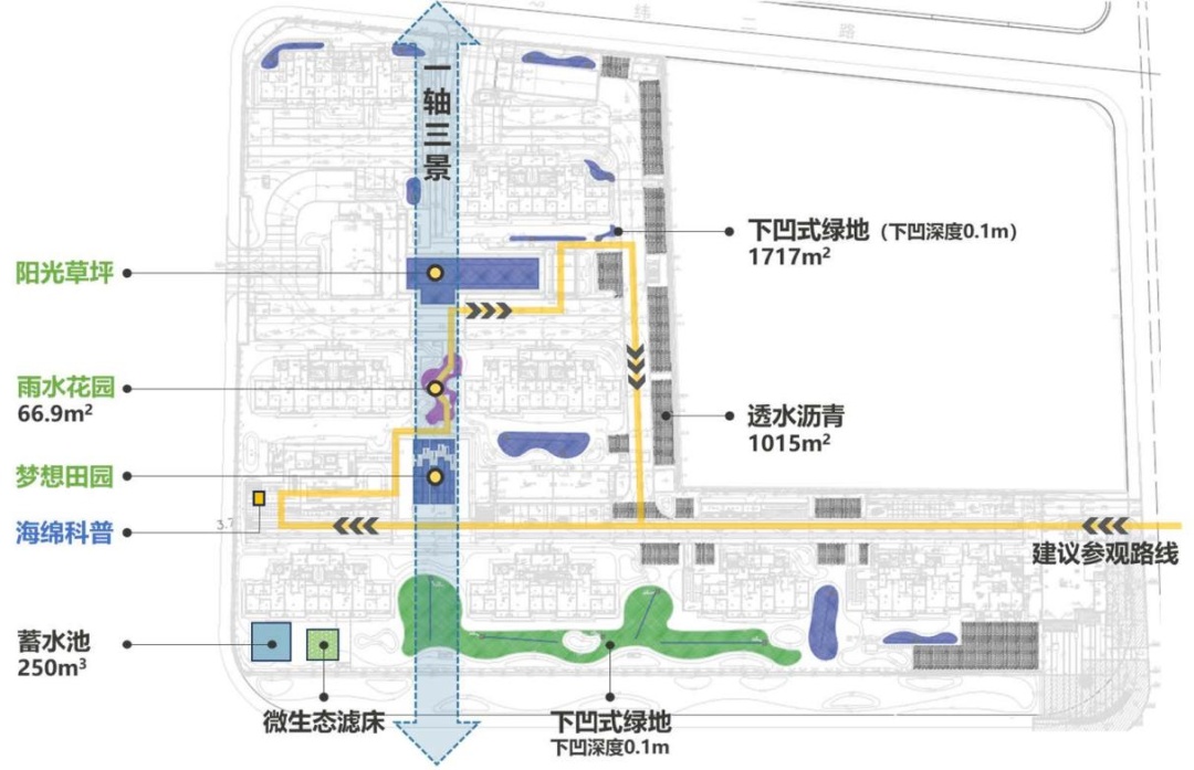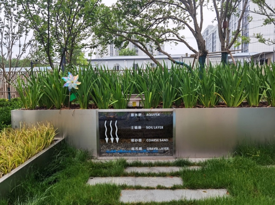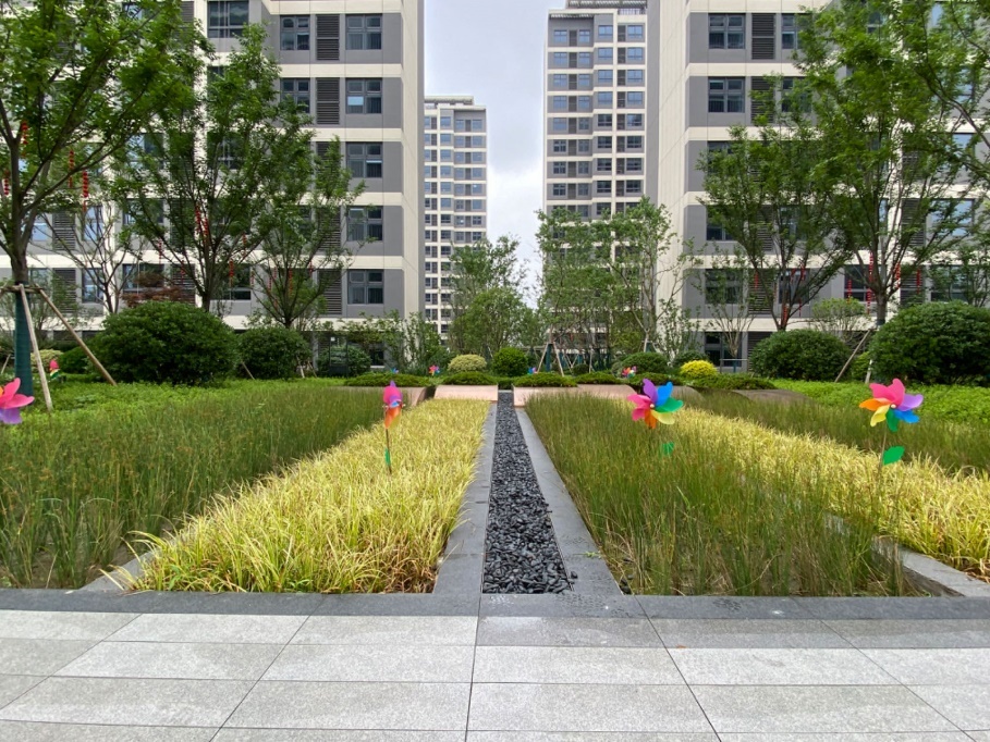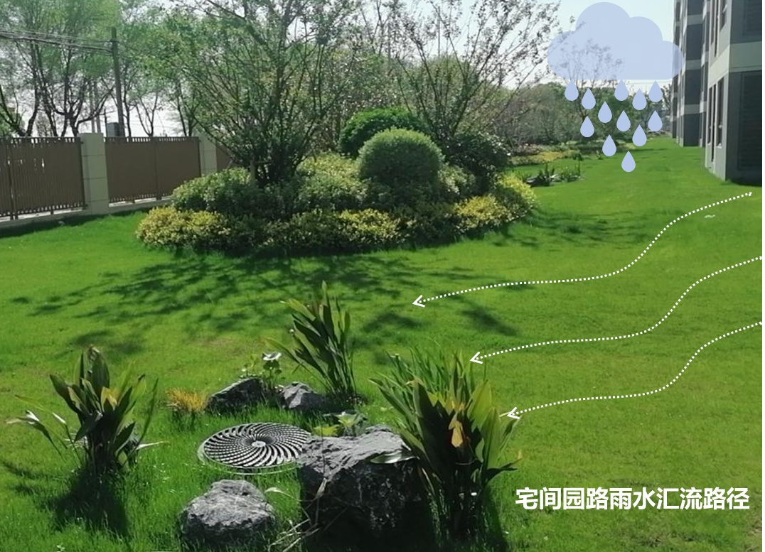 海绵城市总体设计 本项目在设计之初就优先考虑海绵城市设计理念,并将其融合在建筑、景观、给排水设计的全过程,在保证雨水控制与利用功能的同时,实现海绵城市元素与建筑美学的完美融合,使雨水设施成为景观的不可分割的一部分。全场地共计设置1015平方米透水沥青、1717平方米下凹绿地、66.9平方米雨水花园、250立方米雨水蓄水池、49平方米微生态滤床,年径流总量控制率可达到75%、年径流污染控制率可达53%。 雨水径流控制与排放路径图 海绵设施平面布局图 海绵城市设计亮点 亮点一:一幅画卷,轴心贯穿,三景共鸣 本项目将海绵设计理念充分融入景观节点,沿着南北脉络,绘出一轴三景的景观奇迹——阳光草坪、雨水花园、梦想田园,依序展开,自北而南,如诗如画。 ● 阳光草坪 位于项目轴心北侧的阳光草坪,一片逐级下沉、方正辽阔的绿毯铺陈开来,作为重要的雨水调蓄空间,四周台阶侧壁的“溢流井”便是海绵城市的点睛之笔。考虑传统海绵设施溢流雨水井景观效果较为突兀,经与景观、现场施工等单位多轮沟通,创新性采用侧壁开口的溢流设计,可最大化降低对景观整体效果影响,同时满足雨水溢流和安全排放功能。 阳光草坪建成效果实景图 ● 梦想田园 融合海绵理念与自然美,分列布设下沉空间,打造无边界诗意田园风貌,实现雨水的自然积存。利用中心砾石排水沟与海绵设施完成面的高差作为雨水调蓄空间,避免传统溢流雨水井对此处造成的视觉突兀影响。无论晴雨,都展示其独特生态美学,实现可持续与和谐共存。 梦想田园建成效果实景图 ● 雨水花园 雨水花园通过鹅卵石、黑山石与海绵植物的精细化搭配,营造出四重独特景观。首层下凹鹅卵石引导雨水自然调蓄、渗透、流动;二层黑山石营造宁静山石景观;三层矮灌木带来绿意与生机;顶层挺立的乌桕增添色彩。晴日为绿洲,雨天汇成溪,形成优美迷人的海绵景观花园。 雨水花园建成效果实景图 雨水花园现场施工图 亮点二:宅间下凹式绿地,串联生态雨水空间 宅间开敞草皮空间设有下凹式绿地,通过微地形竖向设计,承纳周边道路场地雨水径流,以流动串联的生态雨水调蓄设施为纽带,将楼宇间的绿意满园与生态盎然连接成一幅和谐画卷。 下凹式绿地建成效果实景图 下凹式绿地现场施工图 亮点三:科普启智,共绘生态画卷 雨落花园,绿意盎然,在这里雨水不再是匆匆过客,而是滋养万物的甘露,是自然循环的见证,是生态平衡的守护者。 ● 微生态滤床净化 小小的一片空间,是雨水净化的重要场所。本项目西南角设有1处有效调蓄容积为250立方米的雨水蓄水池,位于地块雨水管网末端,兼顾雨水调蓄与回用功能。雨水净化系统采用微生态滤床工艺,经处理后的雨水回用于场地绿化浇灌和道路冲洗。微生态滤床由种植土层、沙砾层、渗透层、滤料层等组成,通过模拟自然生态系统中的净化过程,利用生物、物理和化学等多种作用去除雨水中的污染物。 微生态滤床建成效果实景图 微生态滤床现场施工图 ● 雨水花园模型 儿童活动场地旁侧设有雨水花园模型,展示了其典型断面做法,自上而下分为蓄水层、土壤层、粗砂层和砾石层,为小区居民展示了雨水花园生态净化的全过程。 雨水花园模型实景图 – END – 往期精选